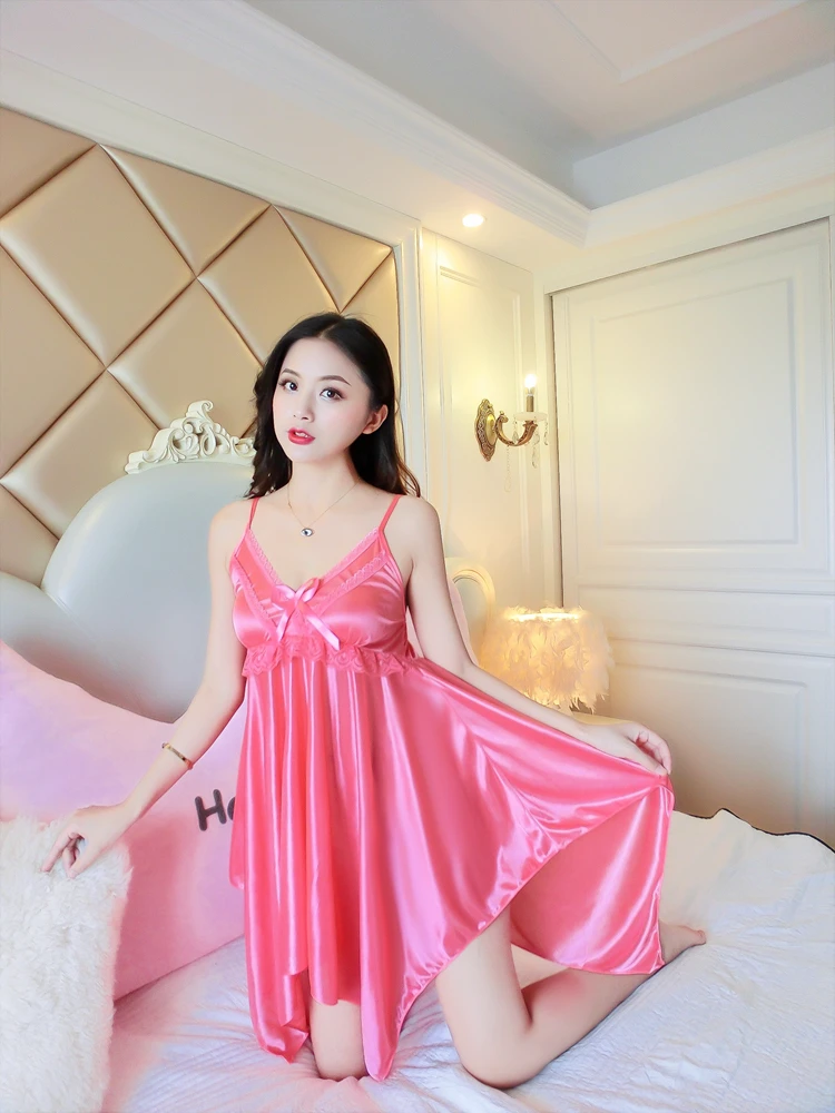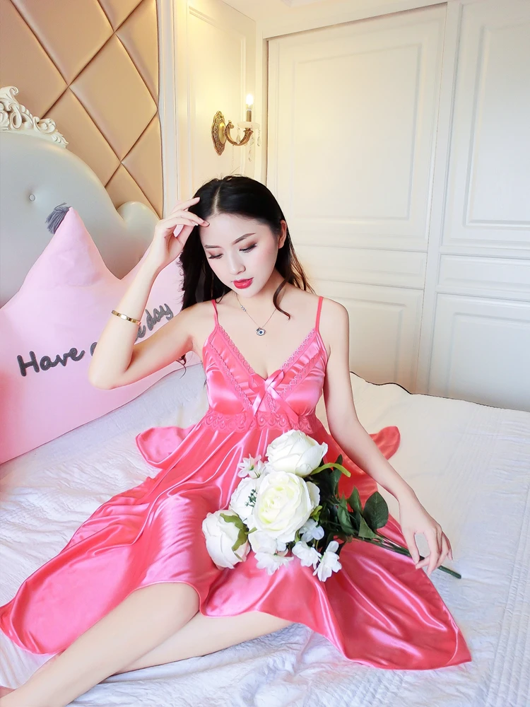 Новая женская шелковая пижама летний пеньюар сексуальное нижнее белье розовая ночная рубашка для женщин Атласные Рубашки для сна сорочка ночная рубашка