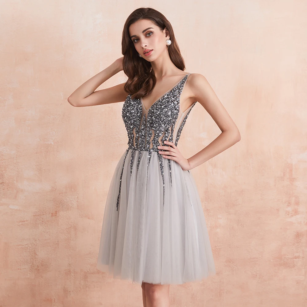 Короткое коктейльное платье с блестящим кристаллом, серое блестящее мини-платье с v-образным вырезом для выпускного вечера