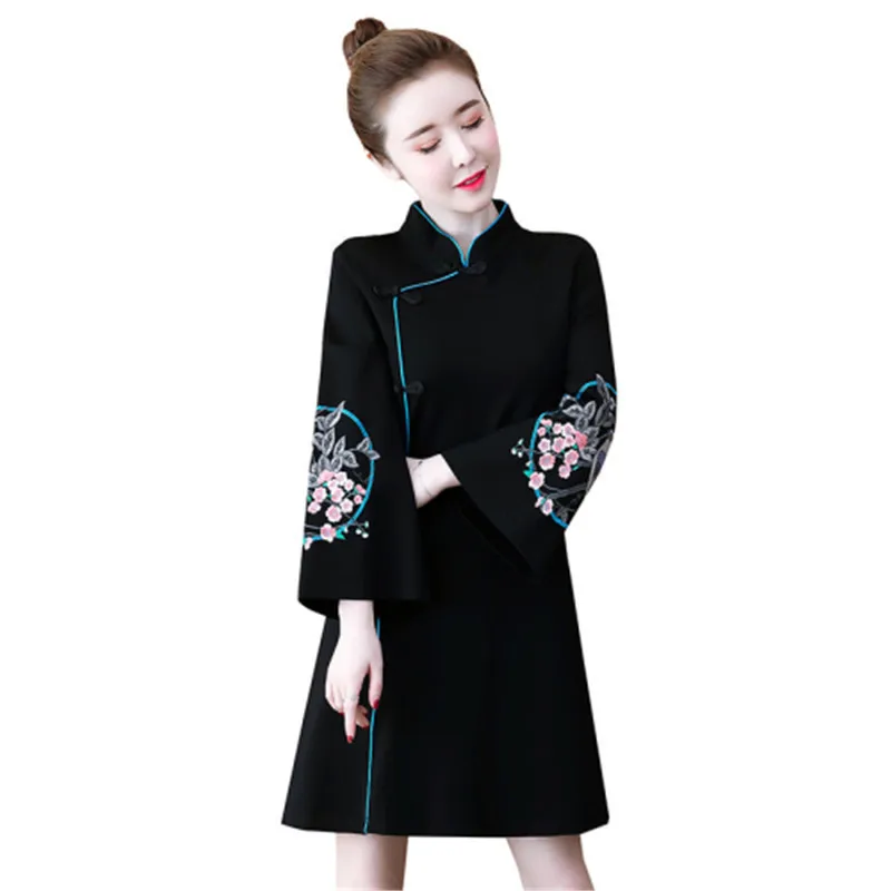 Платье размера плюс, весна 2020, новое модное платье с воротником-стойкой и длинными рукавами в китайском стиле