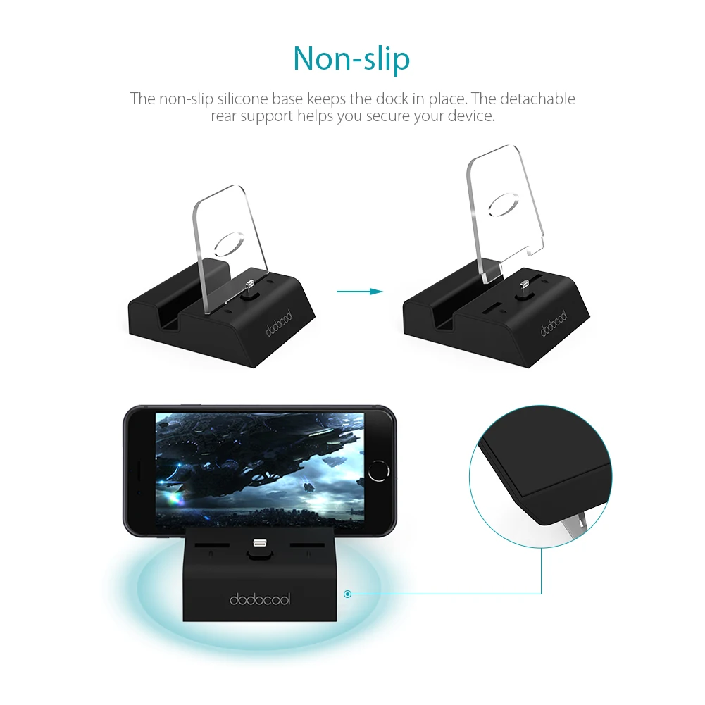 Нескользящая силиконовая основа держит док на месте. Съемная задняя опора помогает защитить ваше устройство.
