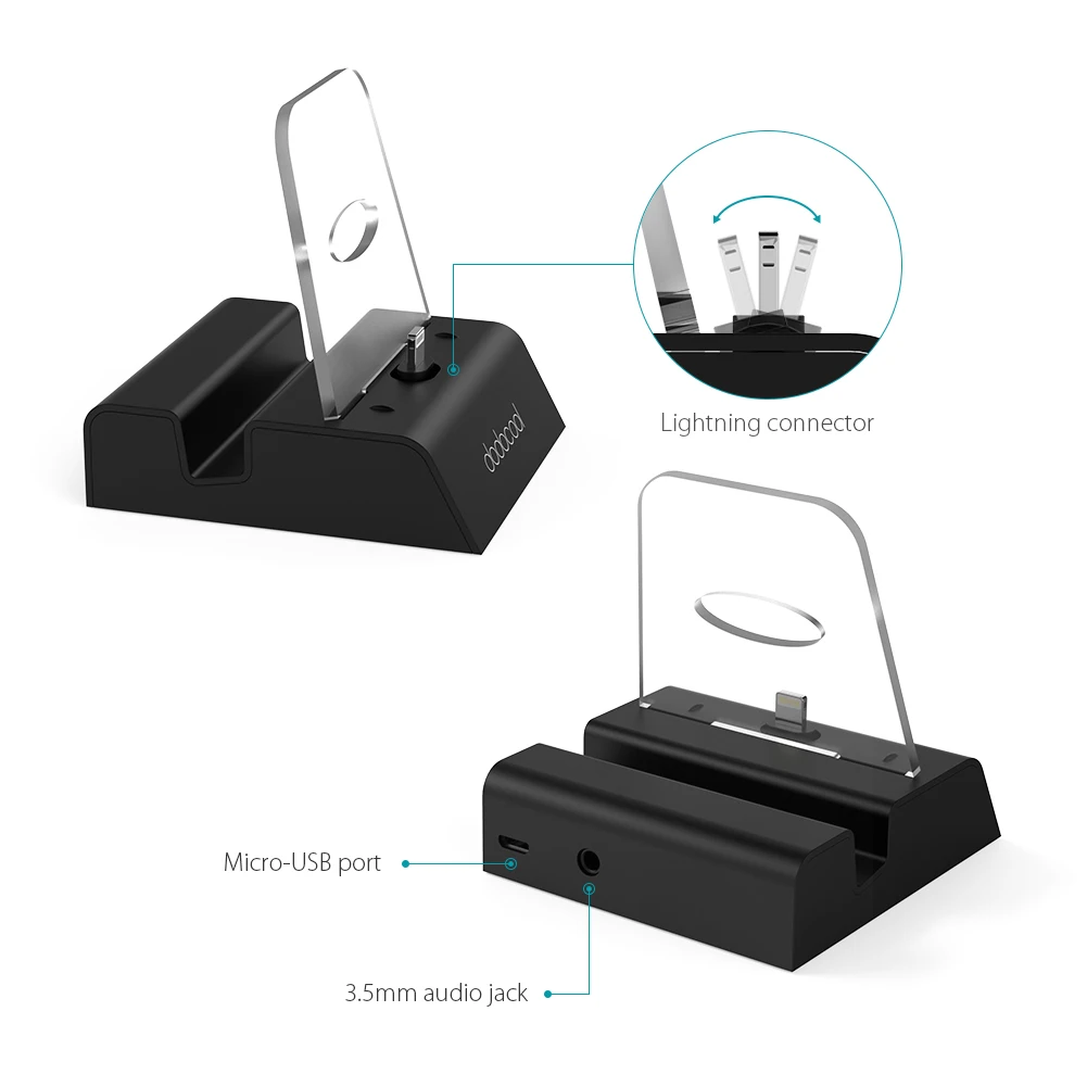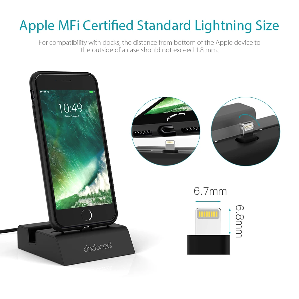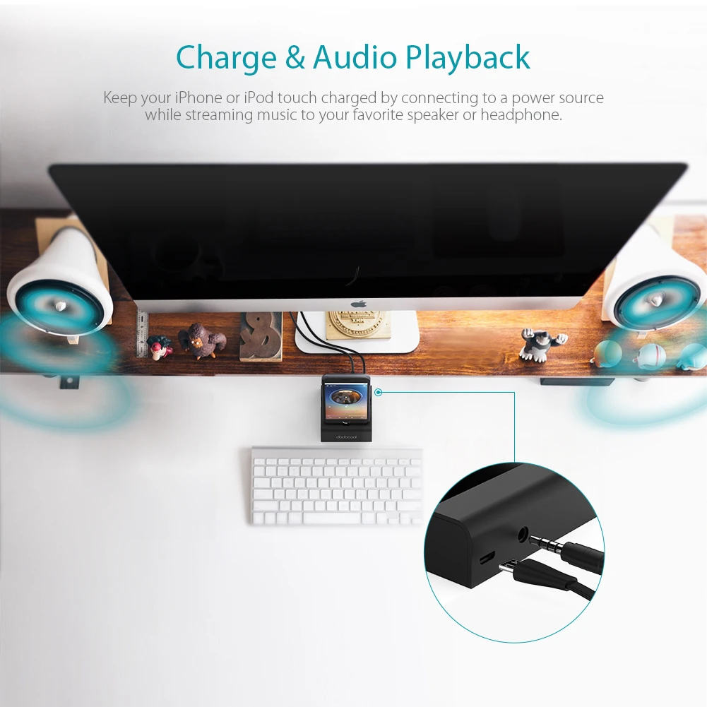 Dodocool MFi сертифицированная док-станция с 3,5 мм аудио разъем позволяет заряжать iPhone или iPod touch, который включает в себя разъем и вашей привычки держать устройство под удобным углом обзора. Во время зарядки вы можете совершать громкие звонки или слушать музыку с наушников или динамиков.
