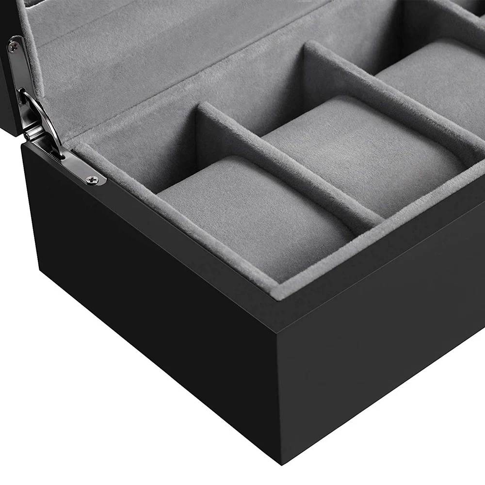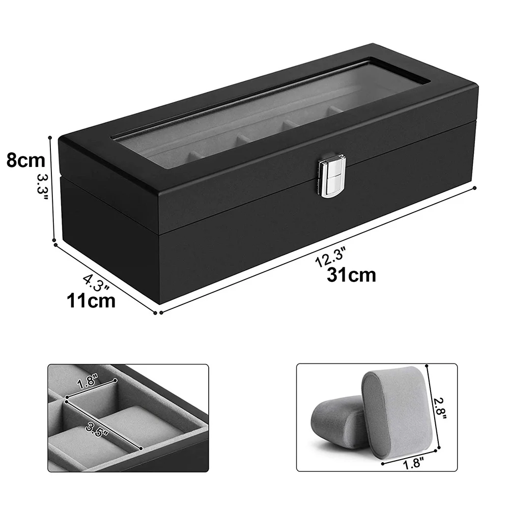 * Крышка с прозрачным стеклом обеспечивает четкое изображение часов внутри. Металлический замок предназначен для простого открытия одной рукой. * 6/10/12 отделений с мягкими съемными подушками Держите часы или браслет в вертикальном положении, чтобы избежать царапин.