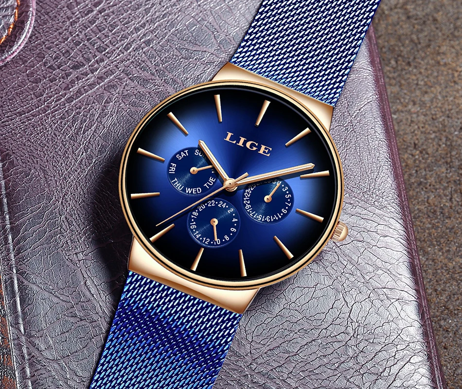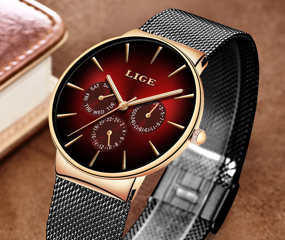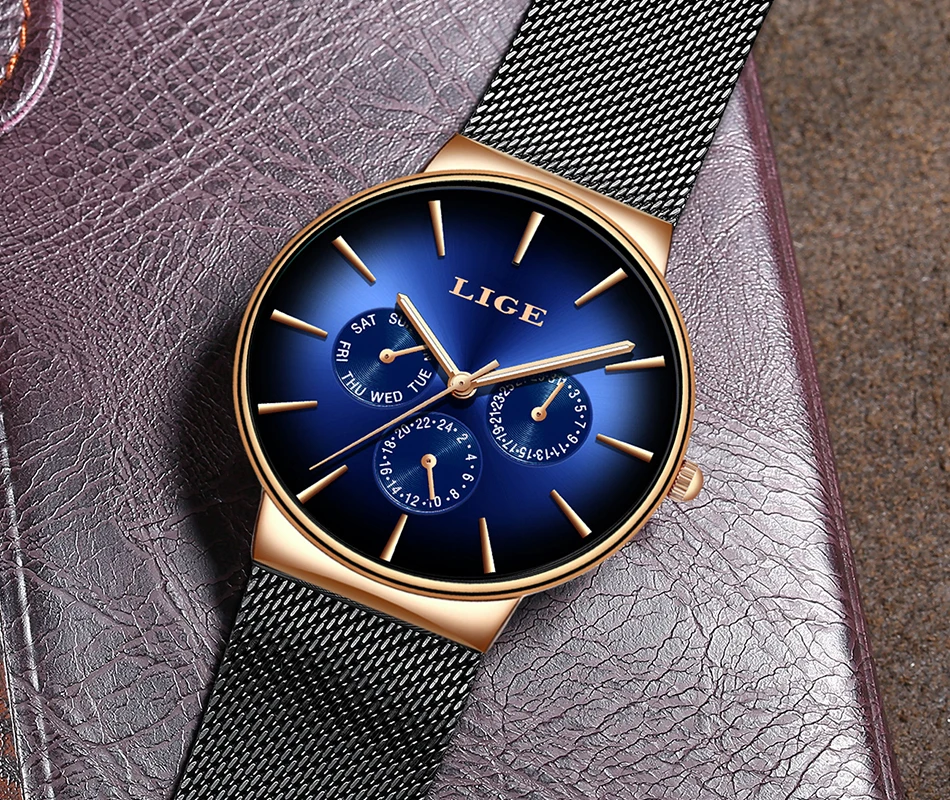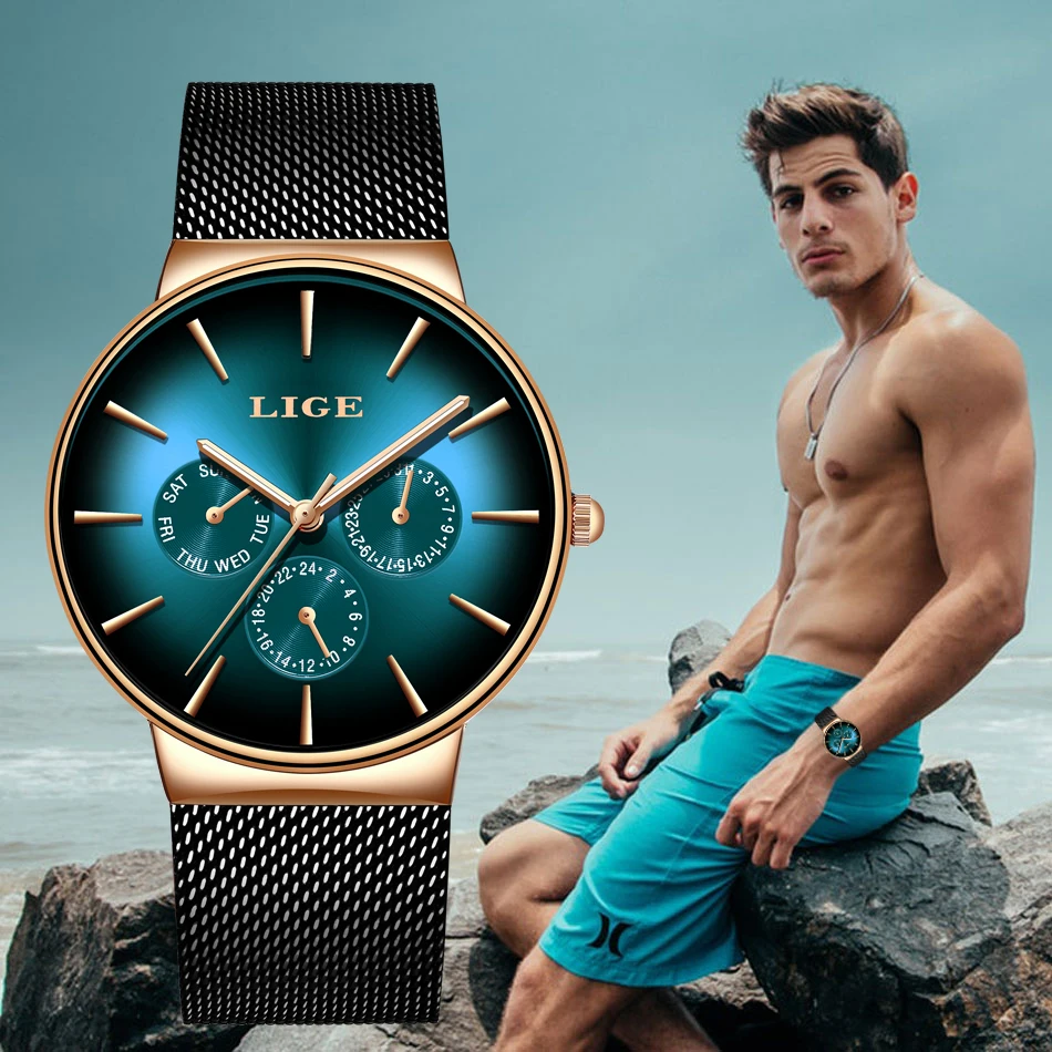 Часы наручные LIGE мужские с сетчатым ремешком креативные брендовые люксовые