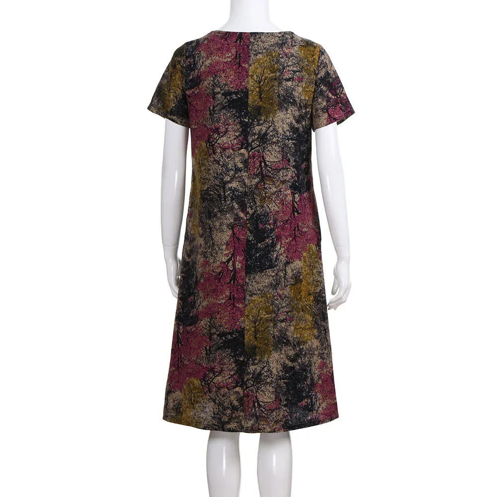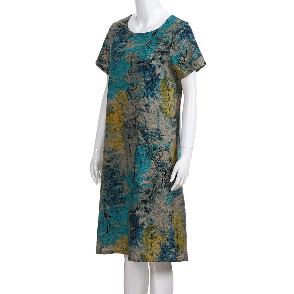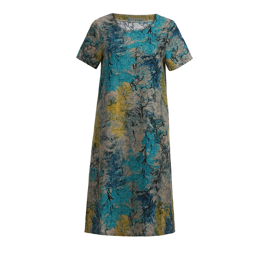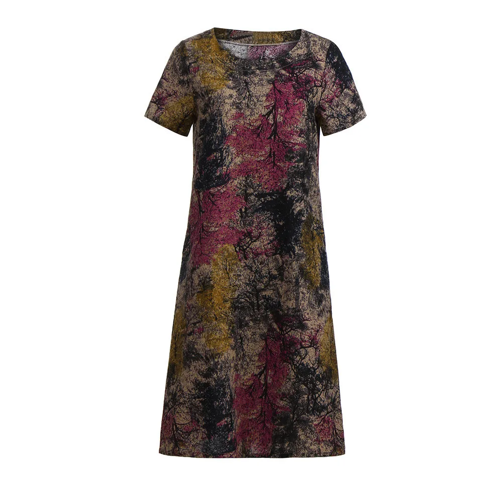 Женское винтажное свободное платье с принтом, коротким рукавом, круглым вырезом и карманом, из хлопка и льна