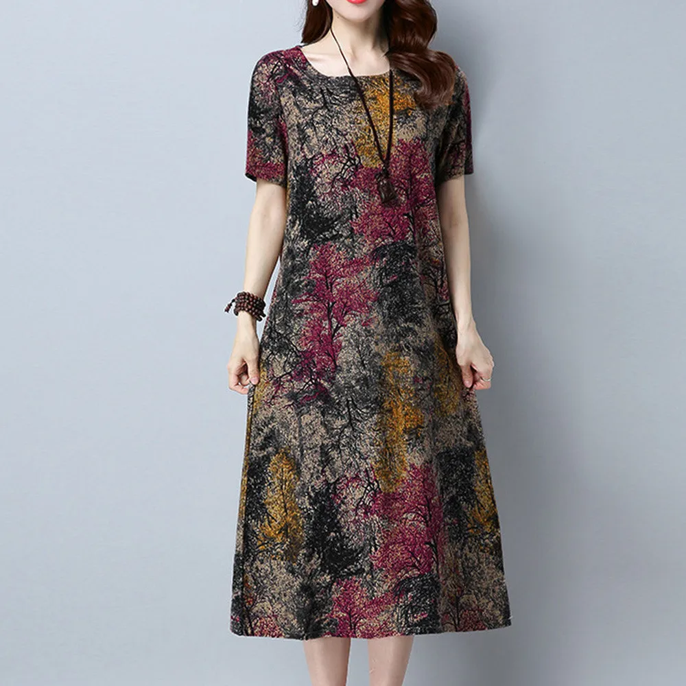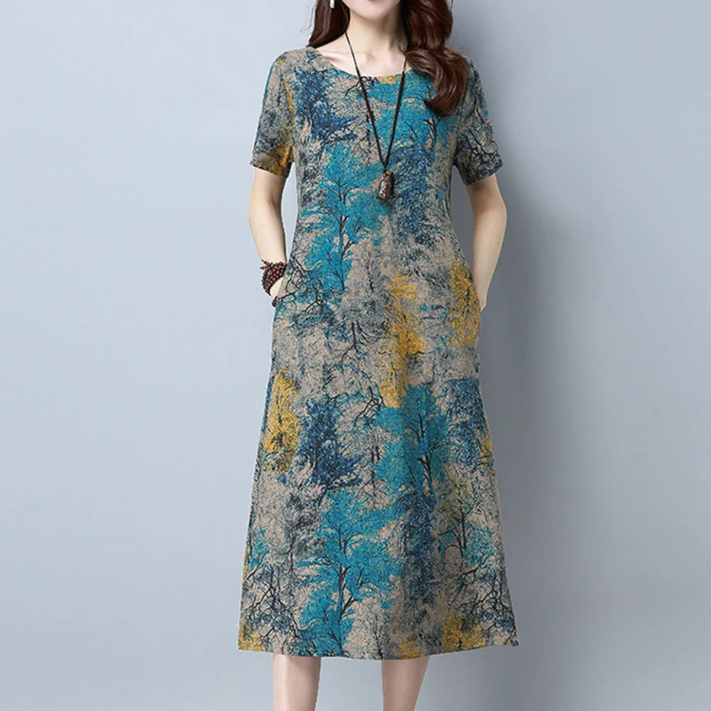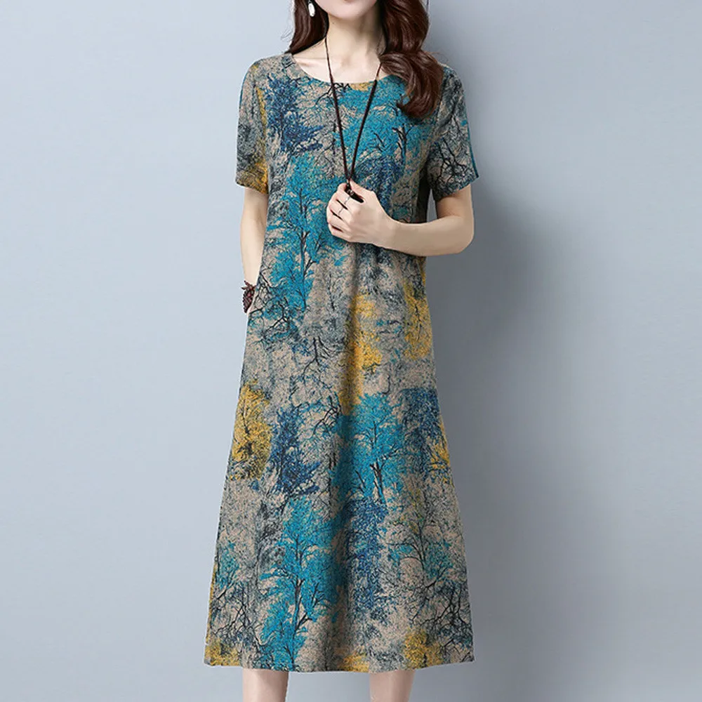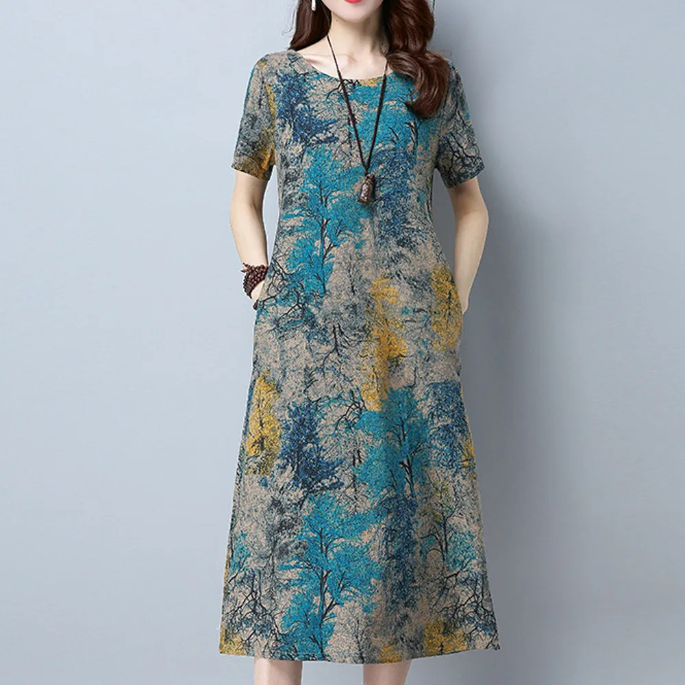 Женское винтажное свободное платье с принтом, коротким рукавом, круглым вырезом и карманом, из хлопка и льна