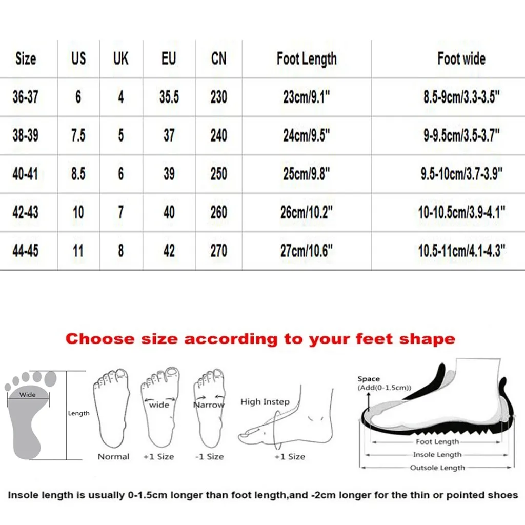 Примечание: размер будет меньше из-за вогнутого дизайна, мы предлагаем вам выбрать Подходящий размер в соответствии с длиной Вашей стопы.