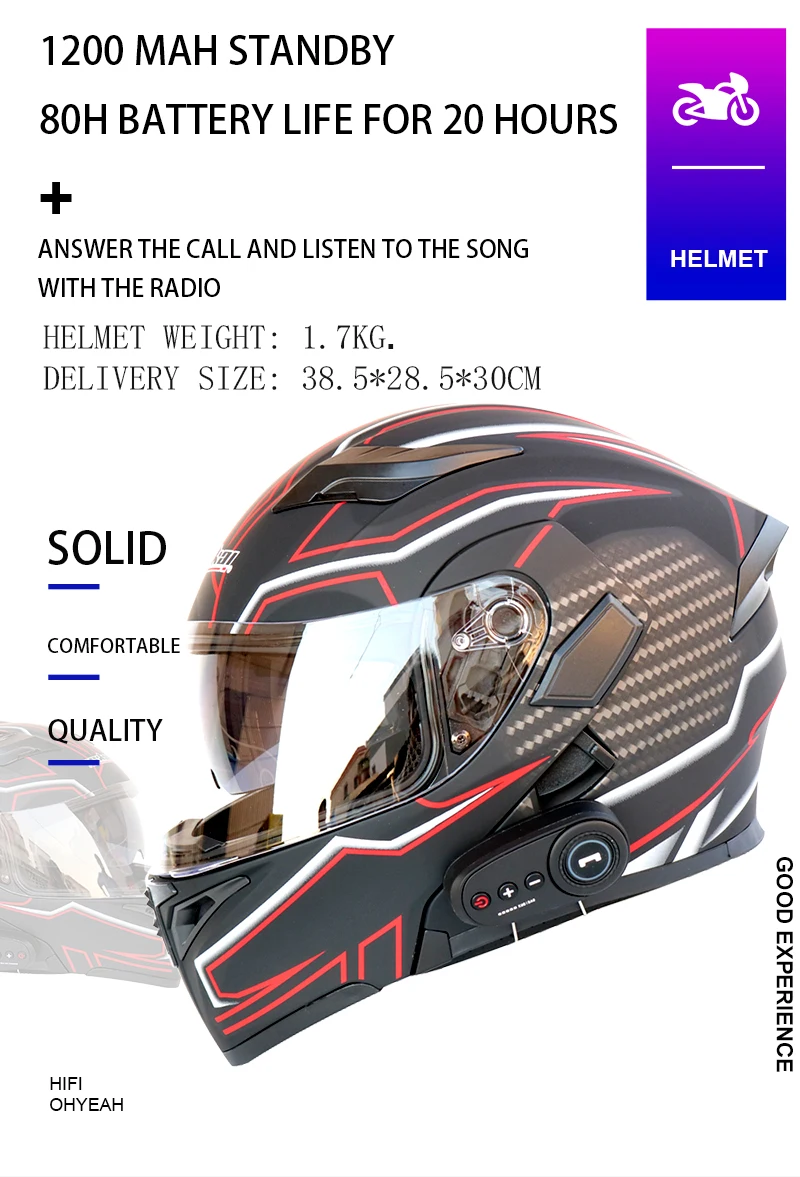 Мотоциклетный Bluetooth шлем, открытый шлем доступен в течение четырех сезонов, поставляется с FM радио 1200 мАч литий-полимерным аккумулятором, 80 часов в режиме ожидания и 20 часов работы от аккумулятора, с 2 4,0 динамиками, хорошее качество звука, технология электронного шумоподавления вызов четкий и стабильный, Съемный Bluetooth оборудование, водонепроницаемый дизайн, Путешествуйте в дождь, не беспокоясь. Дизайн с двойным объективом, внешний объектив прозрачный и высокой четкости, внутренний объектив антибликовый.