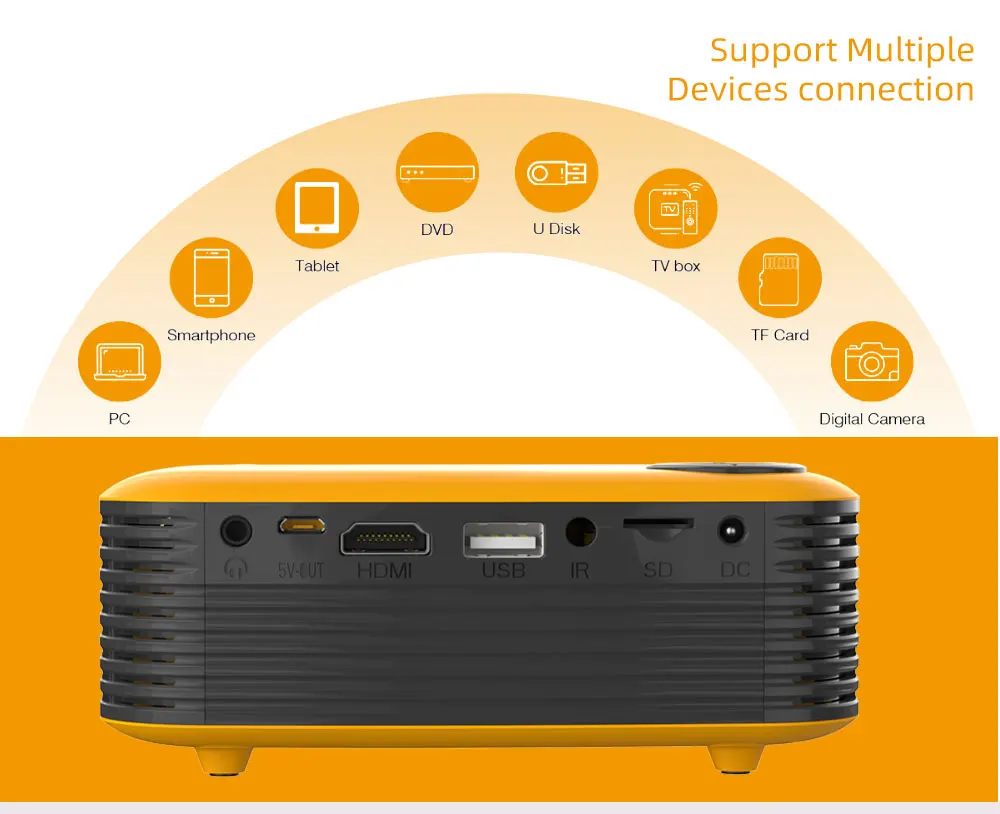 Проектор-новый и модный стиль. Наличие одного проектора высокого качества сделает вашу жизнь счастливее. Благодаря портативности и легковесности этот милый проектор можно разместить в любом месте. На кухне, гостиной, спальне все места могут вмещать проектор мини-размера. Особенности: Портативный и легкий Мини-проектор легкий и удобный по размеру. Меньше, чем iPhone, его можно положить в любое место. Вы также можете брать его в поездку. Поддержка 1080P высокой четкости Высокое разрешение 1080P позволяет вам наслаждаться четкими и яркими изображениями. Настоящий коэффициент контрастности цвета обеспечивает отличный просмотр. Поддержка внешнего аккумулятора Поддержка внешнего аккумулятора 5 в 2 а для источника питания. Используйте в любом месте. Срок службы лампы более 50000 часов. Высокомощный динамик Отличное качество звука и наслаждайтесь чистым звуком. Создайте атмосферу домашнего кинотеатра. Светильник Уход за глазами Проектор отражает светильник, который не повредит детям глаза. Защитите здоровье глаз. Спецификация: Модель товара: A2000 Цвет: белый/оранжевый/черный (на выбор) Технология изображения: один ЖК-дисплей 2 дюйма Разрешение (пиксели): 320*240 Яркость/ANSI: 800 люмен/50ANSI Коэффициент контрастности: 100:1 Однородсветильник: 85% Масштаб дисплея: 4:3/16:9 Диапазон размеров проекции: 14-100 дюйма Расстояние проекции: 0,5-3,2 м Рекомендуемый размер экрана: 30-60 дюймов Коррекция трапецеидальных искажений: нет Коррекция линз: ручная коррекция Методы проекции: Поддержка поворота экрана вверх и вниз влево и вправо Процессор: Allwinner®F1C100 DOLBY Digital: нет Максимальное Поддерживаемое разрешение: 1080P Рабочее напряжение: вход постоянного тока 12 В 2 А Размер изделия: 13,5*9,7*5 см/5,31*3,82 * дюйма (Д * Ш * В) Вес изделия: прибл. 11,46 г Размер посылка: 17*16*8 см/6,69*6,30 * дюйма (Д * Ш * В) Вес посылка: 703/24,8 унции Комплекпосылка ция: 1 мини-проектор 1 адаптер питания 1 * пульт дистанционного управления 1 * HDMI-кабель 1 * Руководство пользователя