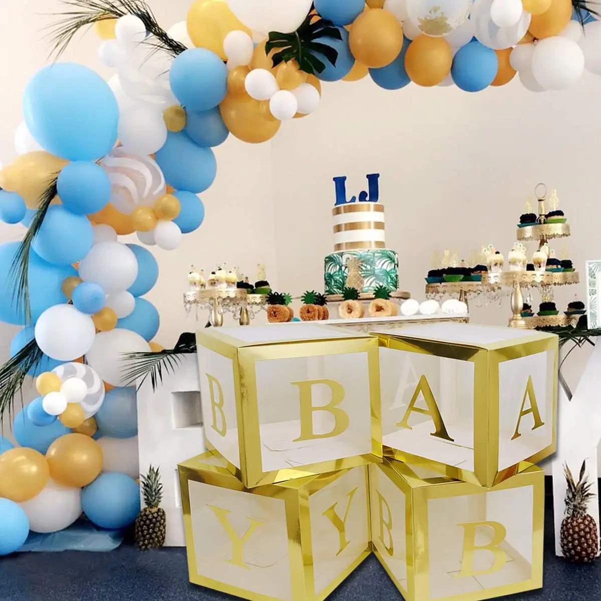 Посылка включает в себя: 4 шт. 12 дюймов x 12 дюймов x 12 дюймов Золотые Коробки, 4 шт. золотые буквы «B» «A» «B» «Y» для 4 шт. латексные шары в комплект не входят, даже вы можете поместить другие украшения в коробки, чтобы создать уникальные вечерние украшения самостоятельно.