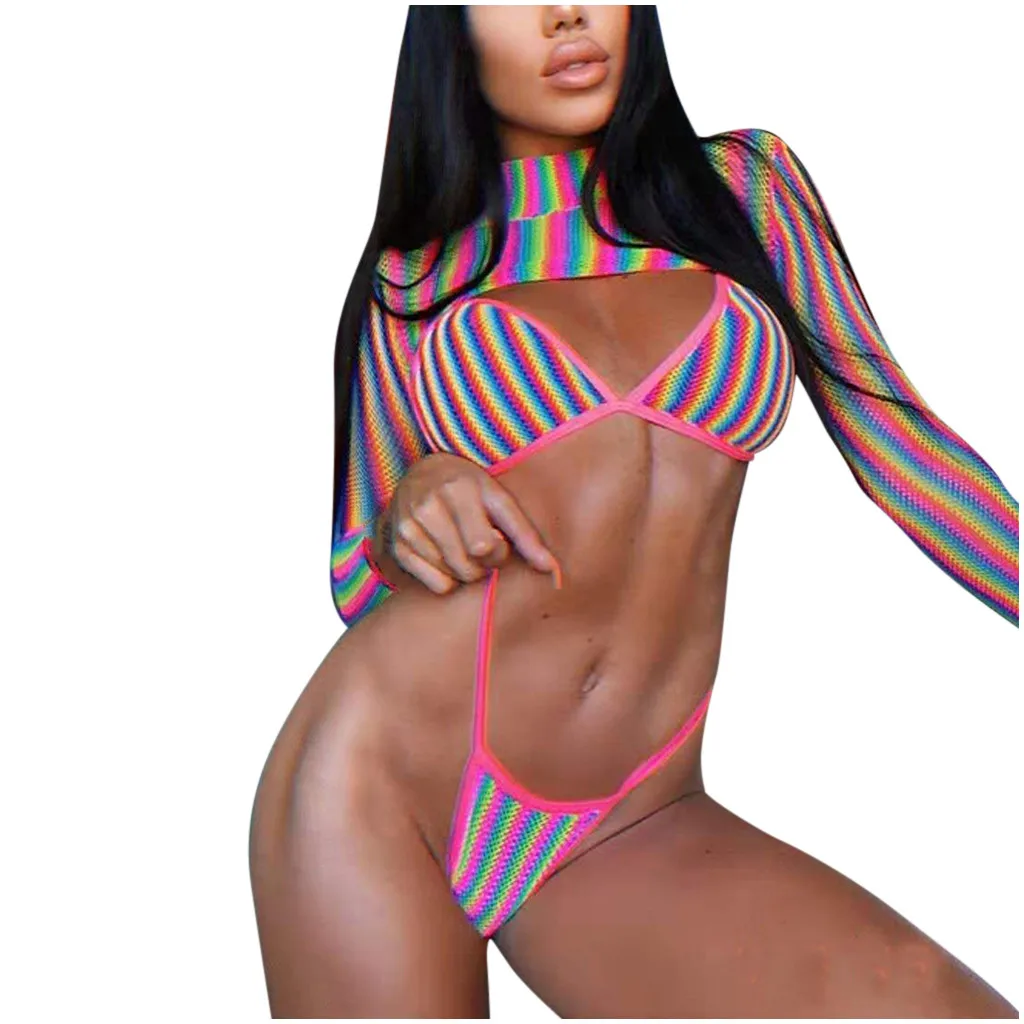Женский купальник с длинными рукавами и радужным принтом в полоску из 3 предметов