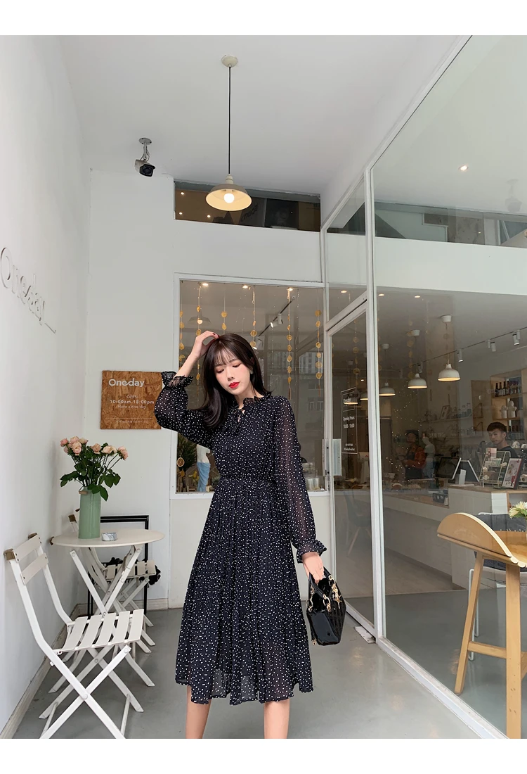 Черное платье женское летнее гофрированное Бандажное шифоновое платье в горошек с цветочным рисунком средней талией с манжетами-фонариками модное платье трапециевидной формы