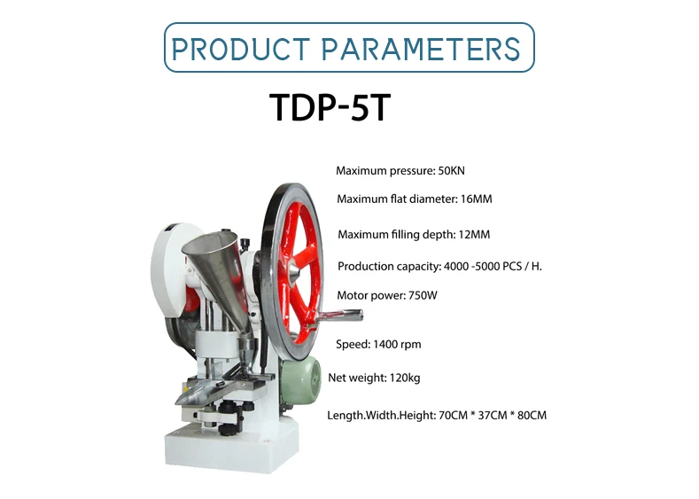 TDP-5T машина для штамповки может прессовать порошок и гранулированное сырье в таблетки, которые могут быть широко использованы на фармацевтических заводах, химических заводах, пищевой фабрике, больницах, научно-исследовательских центрах, лабораторное пробное производство и малое серийное производство. Эта машина обладает хорошей производительностью, сильной адаптируемостью, проста в использовании, проста в обслуживании, небольшой размер, вес под светильник, без мощности также может быть ручной чип. Эта машина оборудована с только один штамповки, пресс-форма для глубина наполнения и толщина планшета может подгоняться; которые могут удовлетворить требования фармацевтической промышленности, чтобы подавить различные китайские и западные таблетки медицины и другие отрасли для подавления различных похожих продуктов.