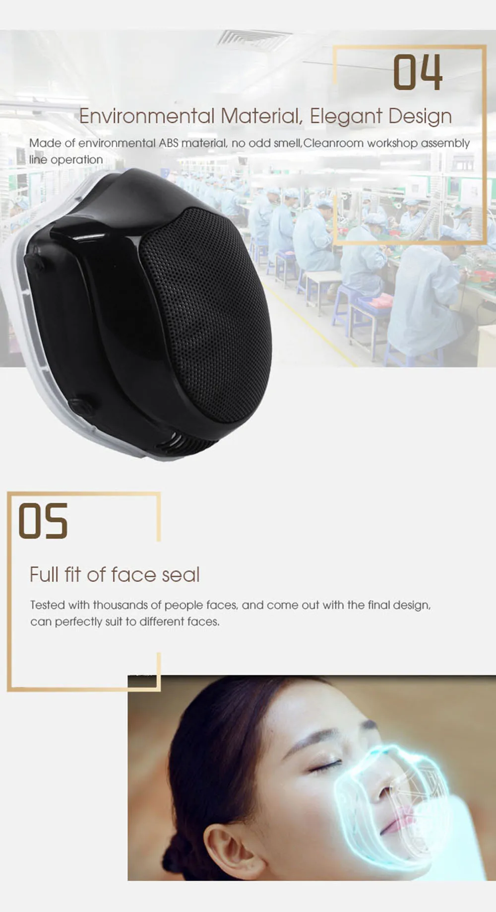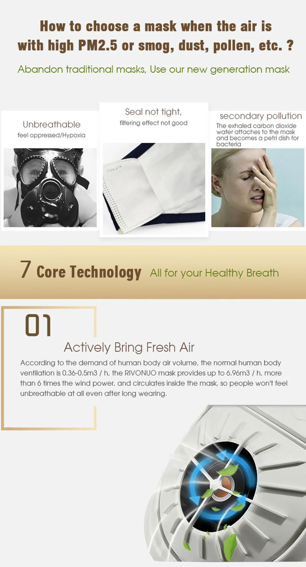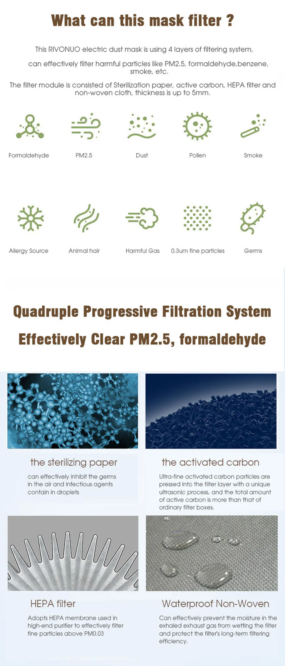 Помогает здоровому дыханию --- Респиратор RIVONUO n95 предназначен для удобной защиты от пыли, пыльцы и других источников загрязнения. Встроенный турбо-вентилятор имеет 2 скоростной Регулируемый сдвиг воздуха, который обеспечивает плавный поток воздуха и положительно пропускает свежий воздух, поэтому вы не будете чувствовать себя недышащей даже после длительного ношения. Встроенный литиевый аккумулятор может работать 4-6 часов за одну зарядку. Комфорт --- Изготовлен из мягкого медицинского силикона на лицевой стороне, RIVONUO респиратор для лица удобно носить. Светильник весит и выглядит очень красиво, не похоже на традиционную медицинскую маску от пыли, которая выглядит странной и некрасивой. Эта Пылезащитная электрическая маска имеет удивительную посылка, может быть очень внимательным подарком для вашей семьи и друзей. Эргономичный дизайн --- Противоаллергенная Пылезащитная маска RIVONUO строго придерживается принципа эргономики, 3D адаптируется к лицу и хорошо запечатывает, поэтому не запотевает очки во время ношения этой маски. Крышка магнитной всасывающей маски легко разбирается, что позволяет легко заменить фильтры. Фильтр HEPA 4-слойной структуры (углерод, HEPA, стерилизованная бумага, Нетканая ткань) может эффективно блокировать 98% содержимого загрязнения воздуха. Универсальное использование --- Противозагрязняющая маска RIVONUO подходит для проектов по улучшению дома: как маска для краски, маска для очистки, работы по дереву, скашивания и т. д. Его также можно использовать как маска против аллергии для фильтрации линз и как маску для гриппа. Наши клиенты также используют маску для лица для бега, велоспорта и других видов активного отдыха. Противопылезащитная маска унисекс, с 2 свободными растягивающимися силиконовыми петлями для ушей и 2 зажимами для регулировки лучшей длины в соответствии с различными гранями. Многоразовые и сменные --- Безопасная маска RIVONUO многоразовая, лицевой силикон Съемный и моющийся, фильтр маски заменяется, чтобы обеспечить очиститель воздуха для защиты рта, носа и легких. Он удобен для длительного ношения и легко чистится.