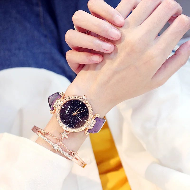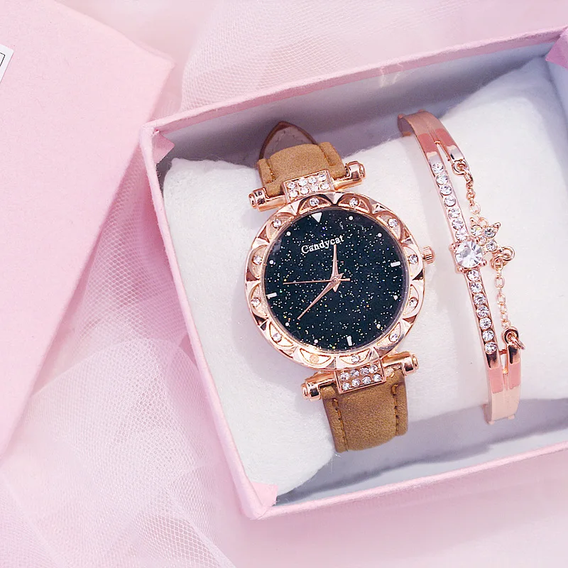 Браслет из розового золота Женские часы Звездный браслет с изображением неба набор часов женские повседневные кожаные кварцевые наручные часы Relogio Feminino