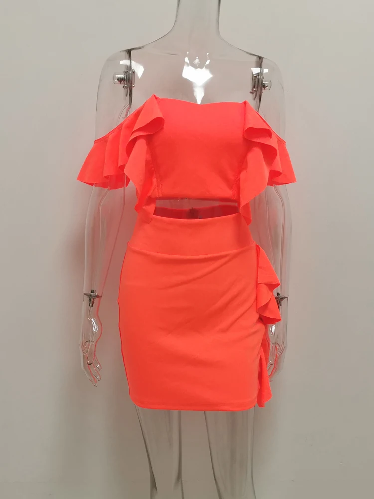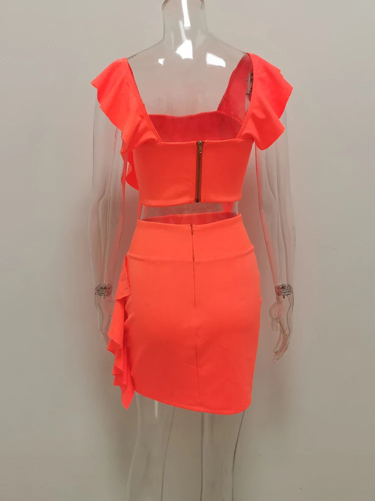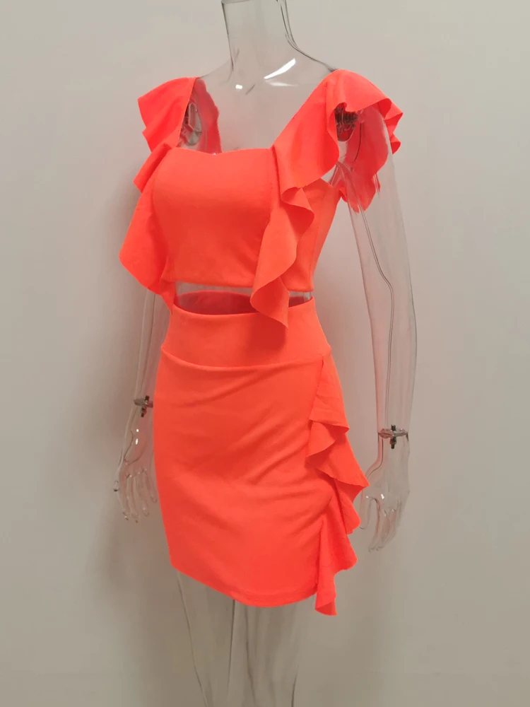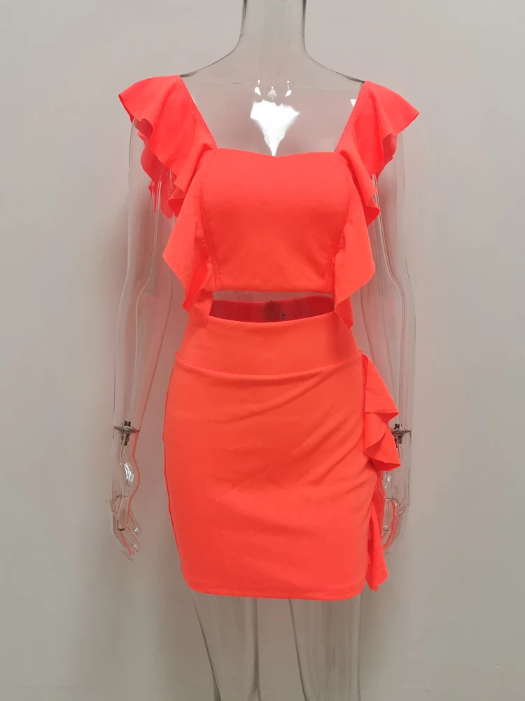 Комплект из двух предметов оранжевого цвета; Укороченный топ с оборками на бретелях; Мини-юбка; Комплекты для женщин; Элегантные пикантные вечерние комплекты из 2 предметов; Женская одежда