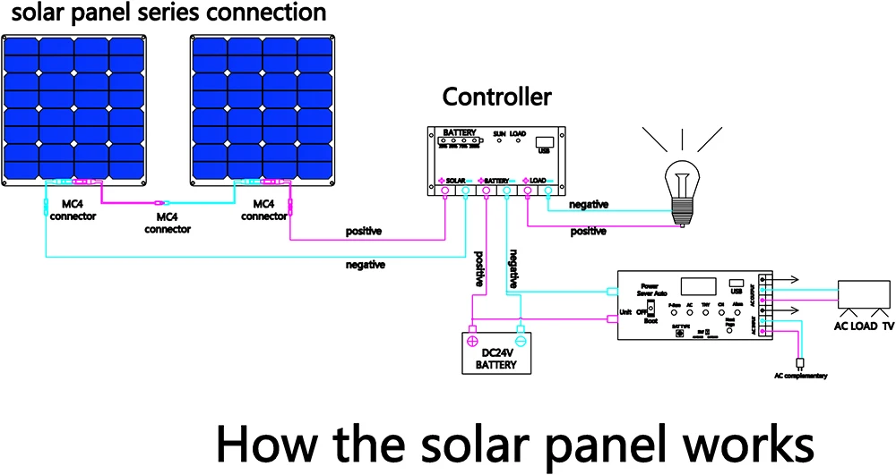 1. Подключите аккумулятор к зарядному регулятору-плюс и минус. Он покажет 1, если он обнаруживает аккумулятор 12 В, 2, если он обнаруживает батарею 24 В. 2. Подключите фотоэлектрический модуль к регулятору-плюс и минус. 3. Подключите потребителя к регулятору заряда-плюс и минус.