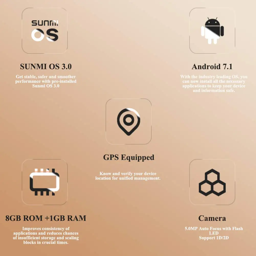 ОС: Android 7. SUNMI OS Процессор: четырехъядерный процессор 1,3 ГГц память: 1 Гб ОЗУ + 8 Гб ПЗУ 2 Гб ОЗУ + 16 Гб ПЗУ (опционально) Дисплей: 5,45 "HD + 1440*720 18:9 IPS Камера: автофокус 5.0MP со светодиодной вспышкой, Поддержка 1D/2D Wi-Fi: 2,4G/5G поддержка lEEE 802,11 a/b/g/n Bluetooth: Поддержка Bluetooth 2,1/3,0/4,0 поддержка BLE Динамик: 95dB Вес: 364 г (включая батарею) Клавиши: кнопка включения, увеличение/Уменьшение громкости Батарея: литий-полимерный аккумулятор 2580 мАч @ 7,6 В Связь: 4G/3G/2G Интерфейс: тип-c Поддержка OTG Слот: NANO sim-карта * GPS:GPS