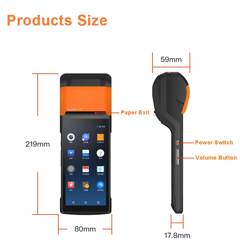 1. С рулоном диаметром 50 мм, который удваивает емкость бумаги, будьте готовы сэкономить на дополнительных затратах. 2. Ускорьте ваши сделки с новейшим принтером Seiko, который улучшает скорость на 16%, делая его более эффективным. 3. С экраном 5,45 "и корпусом 17,8 мм, V2 делает удобную для пользователя систему, которая является портативной и легко держать в руке. 4. Вместе с этим он поставляется с ярким hd-экраном 1440*720 и динамиком 95 дБ с четким качеством голоса, что гарантирует вам 5. V2 поддерживает все 4G Носители с двухдиапазонным Wi-Fi на всем протяжении от 2,4 ГГц до 5 ГГц, что обеспечивает высокую стабильность сетевого подключения.