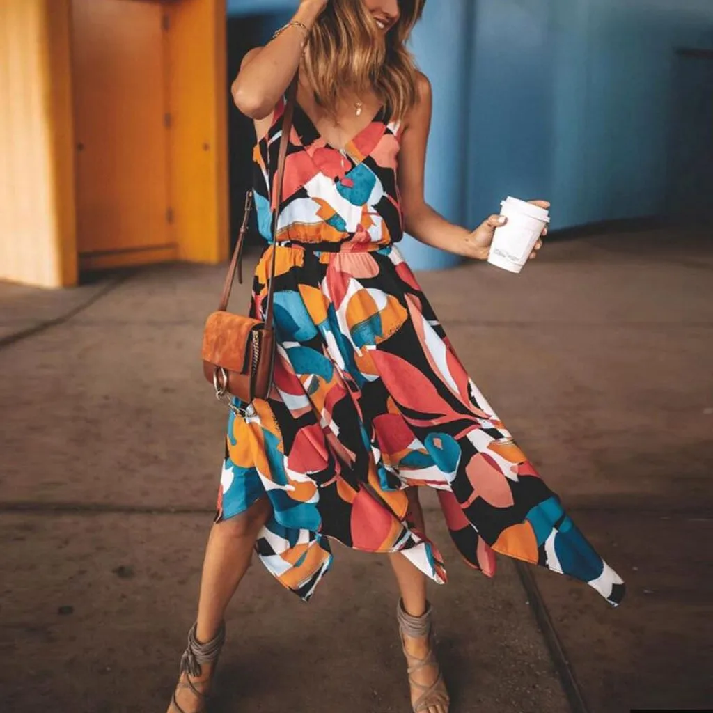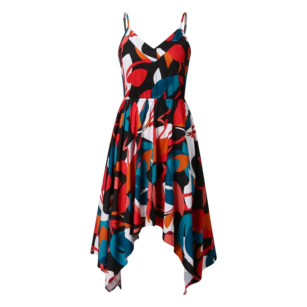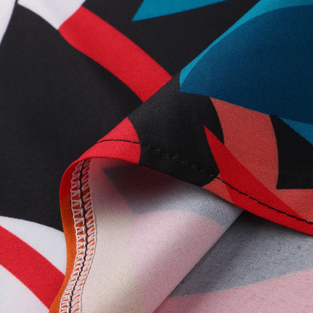 Повседневное платье с богемным принтом, v-образным вырезом и коротким рукавом, украшенное модным дизайном. Легкая и неэластичная ткань. Свободный силуэт.