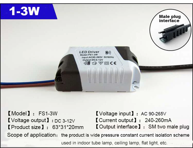 Спецификация: Мощность: 1-3 Вт/4-7 Вт/8-12 Вт/15-18 Вт/18-24 Вт Напряжение на входе: 90-265 в