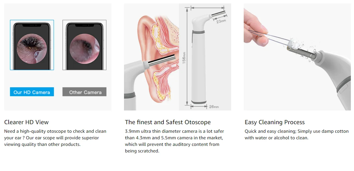 1. Почему вам нужно купить отоскоп: когда вам нужно проверить дополнительные ушные вкладыши или ушные инфекции, вы можете использовать отоскоп, чтобы проверить ухо, есть ли насекомое, посторонние вещества, или в ушах. Это полезный незаменимый бытовой инструмент, который может сэкономить ваше время и деньги. 2. Снимок и Запись видео: пользователь может сделать живое изображение и видео с ПК или смартфона Android самостоятельно и сохранить его, чтобы отправить к своему личному врачу для профессионального руководства. 3,720 P HD Ушная Камера: 4,3 мм камера наблюдения с 6 регулируемыми светодиодными лампами может работать четко в темноте и узком ушном канале. Не переживайте о перегреве! Обновленный чип больше не заставит вас чувствовать перегрев. Он подходит не только для peolpe, но и для вашего питомца, вы можете использовать для проверки ушной раковины и ушного клеща. 4.IP67 Водонепроницаемый отоскоп: водонепроницаемый класс отоскопа инспекционной камеры является IP67 и пожалуйста, очистите ушную камеру водой или протрите спиртом перед использованием отоскопа, он будет более чистым и безопасным для вас. 5. Совместимость: подходит для телефонов Android, Windows PC и MacBook