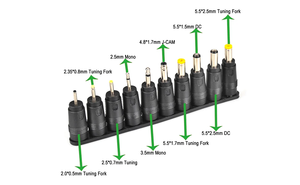 6,0*1,4 мм Якорный штифт: совместимый для Sony, совместимый для Fujitsu 6,3*3,0 мм Камертон (зеленый): совместимый для Acer, совместимый для Toshiba, совместимый для NEC 5,5*2,5 мм DC: совместимость с Lenovo, Совместимость с Asus, Совместимость с acer, Совместимость с MSI, Совместимость с BenQ, Совместимость с HEDY, Совместимость с Toshiba, Совместимость с IBM, совместимость с шлюзом, Совместимость с Malata, Совместимость с Haier, Совместимость с QiXi 5,5*2,1 мм DC (синий): совместимость с acer, Совместимость с Toshiba, Совместимость с HP 5,5*1,7 мм тюнинговая вилка (желтый): совместимость с Hasee, Совместимость с Malata, Совместимость с Acer, Совместимость с Lenovo, Совместимость с Asus, Совместимость с BenQ, Совместимость с Toshiba, совместимость с NEC, Совместимость с Shenzhou 5,5*3,2*1,1 мм Якорный штифт (желтый): 4,8*1,7 мм Камертон (желтый): совместимый с HP, совместимый для Sony, совместимый для Asus, совместимый для NEC, совместимый для Delta, совместимый для Compaq 4,0*1,7 мм тюнинговая вилка (желтый): совместим с Asus, совместим с BenQ, совместим с Acer, Son, совместим с PSP, gps-навигатором, совместим с HP(mini), ноутбуком 3,5*1,35 мм DC (красный): совместимый для Sharp, совместимый для Dell 3,0*1,1 мм DC: ноутбук