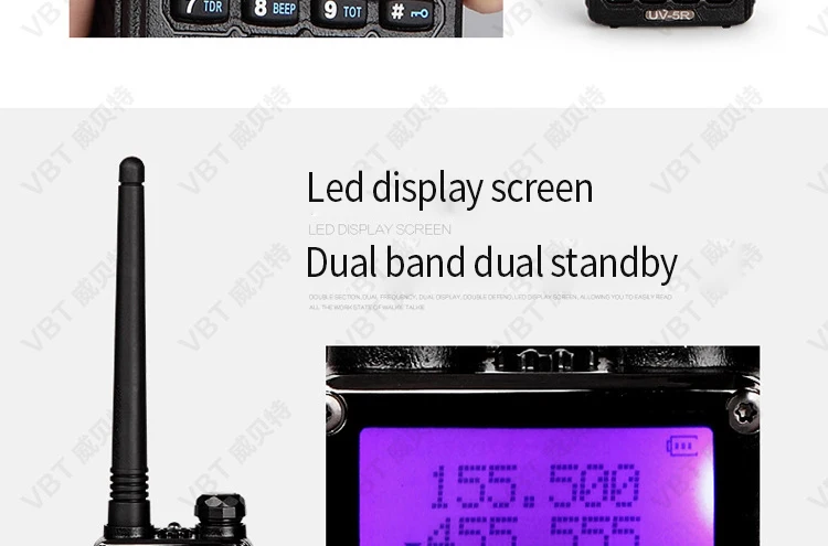 1. Диапазон частот: 136-174 / 400-520 МГц 2. Двухдиапазонный дисплей, двойной Freq. Дисплей, двойной режим ожидания 3. Выходная мощность: 5 Вт (макс.) 4. 128 каналов 50 CTCSS и 104 DCS 5. Встроенная функция VOX 6. 1750 Гц тон Brust 7. Fm-радио (65,0 МГц-108,0 МГц) 8. Светодиодный фонарик 9. Большой ЖК-дисплей 10. Высокая/низкая мощность RF переключается 11. 25 кГц/12,5 Кгц переключаемый 12. Вызова скорой помощи 13. Низкая Батарея оповещения 14. Батарея Saver 15. Таймер 16. Блокировка клавиатуры 17. Монитор канал 18. Канал шаг: 2,5/5/6.25/10/12.5/25 кГц 19. ROGER набор