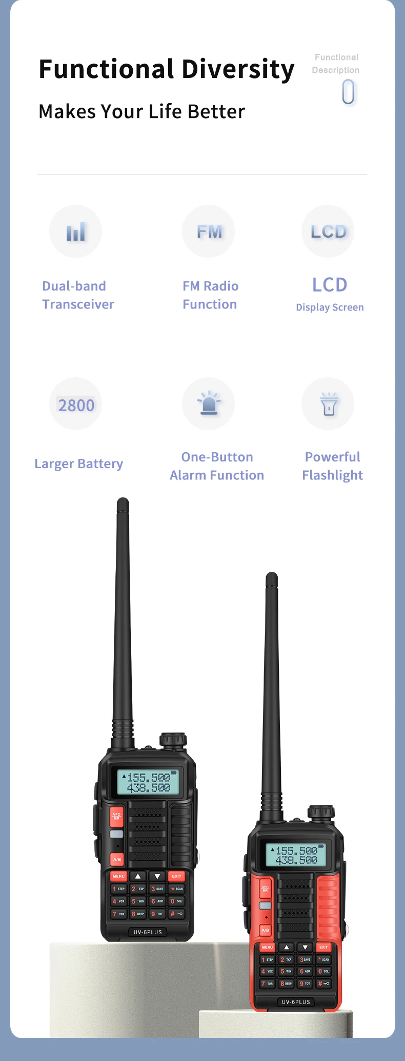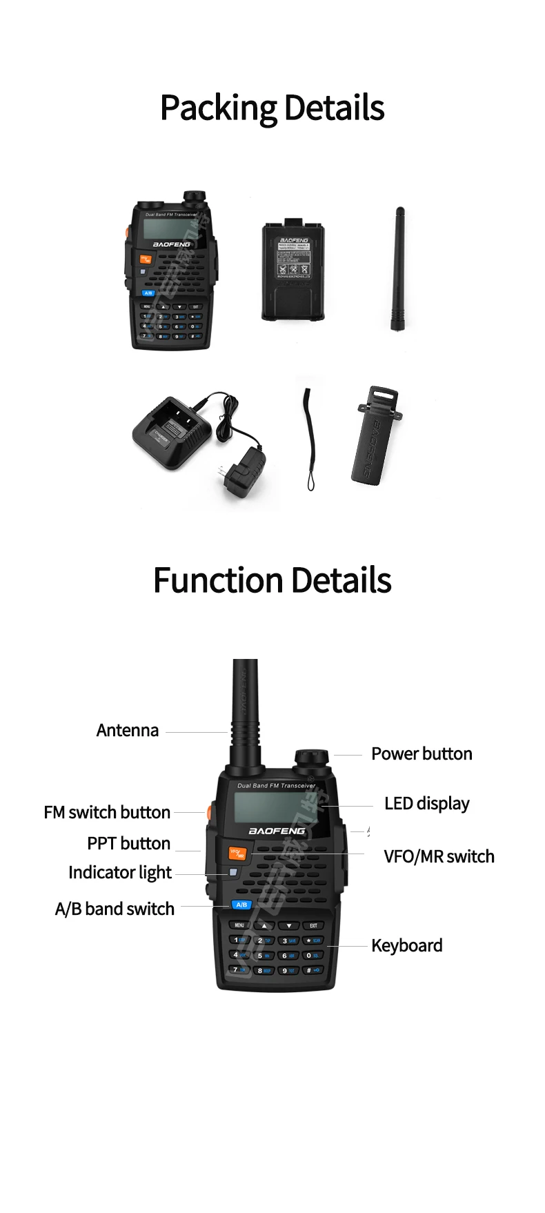 1. Диапазон частот: 136-174 / 400-520 МГц 2. Двухдиапазонный дисплей, двойной Freq. Дисплей, двойной режим ожидания 3. Выходная мощность: 7 Вт (макс.) 4. 128 каналов 50 CTCSS и 104 DCS 5. Встроенная функция VOX 6. 1750 Гц тон Brust 7. Fm-радио (65,0 МГц-108,0 МГц) 8. Светодиодный фонарик 9. Большой ЖК-дисплей 10. Высокая/низкая мощность RF переключается 11. 25 кГц/12,5 Кгц переключаемый 12. Вызова скорой помощи 13. Низкая Батарея оповещения 14. Батарея Saver 15. Таймер 16. Блокировка клавиатуры 17. Монитор канал 18. Канал шаг: 2,5/5/6.25/10/12.5/25 кГц 19. ROGER набор