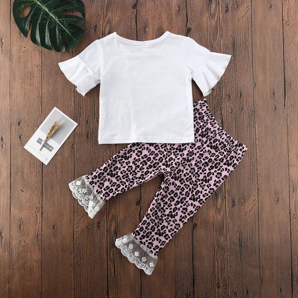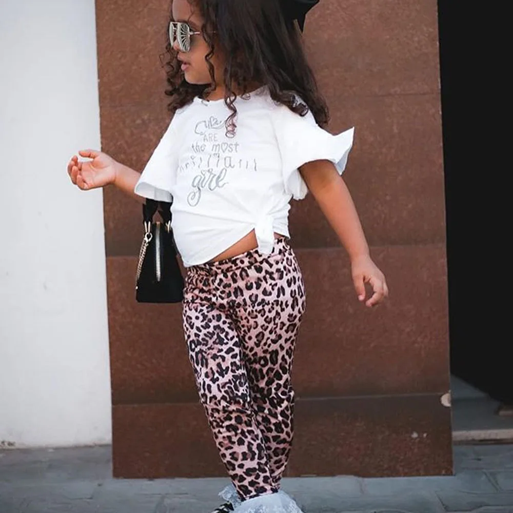 Комплект летней одежды из 2 предметов для маленьких девочек, топ с короткими рукавами и оборками с буквенным принтом + длинные узкие штаны с леопардовым принтом Идеально подходит для вашей девочки в повседневной одежде и подходит для фотографии, которая такая милая. Повседневная детская одежда изготовлена из мягкого, мягкого и удобного материала высокого качества. Красивая и удобная одежда для маленьких девочек. Технические характеристики Материал: хлопок. Размер: 90, 100, 110, 120, 130. Пол: женский.