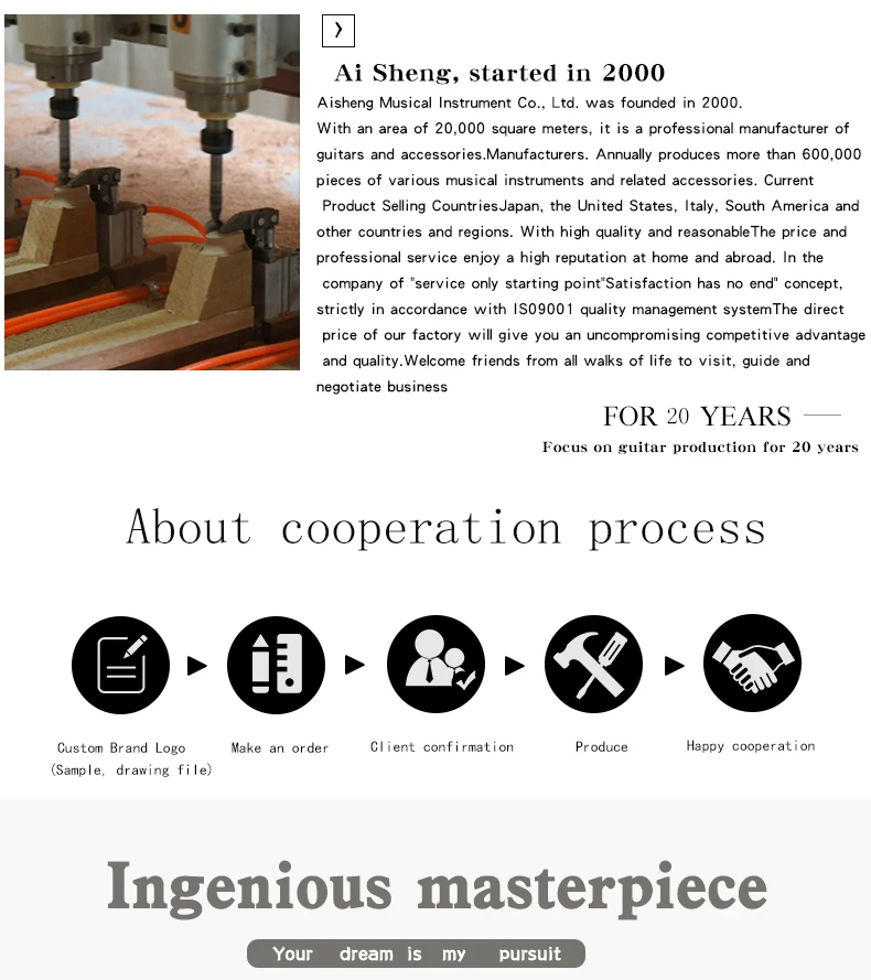 Этот магазин имеет три фабрики и три производственные линии, Основное производство: 38/39/40/41 приглашаем посетить Фабрика для руководства, телефонная консультация для обсуждения Сотрудничество, пожалуйста, примите большое количество, пожалуйста, свяжитесь с Онлайн служба поддержки клиентов, чтобы изменить перевозку и оплатить снова ~ Ai Sheng, начата в 2000 году Компания Aisheng Musical Instrument Co., Ltd. была Основана в 2000 году. С площадью 20000 квадратных Метров, это профессиональный производитель гитар, И производители аксессуаров. Ежегодно производит более 600000 штук Различных музыкальных инструментов и сопутствующих аксессуаров. Товары Хорошо продаются в Китае, Японии, США, Италии, Южной Америке и других странах Стран и регионов. Высокое качество, разумные цены и профессионализм Услуги пользуются высокой репутацией в стране и за рубежом. В компании "Сервис" Только имеет отправную точку, «удовлетворение не имеет конца» концепции, мы строго следуем IS09001 система управления качеством для производства нашей фабрики Соединительные цены дадут вам бескомпромиссное конкурентное преимущество И качество. Приглашаем друзей из всех слоев общества посетить, направлять и вести переговоры Бизнес