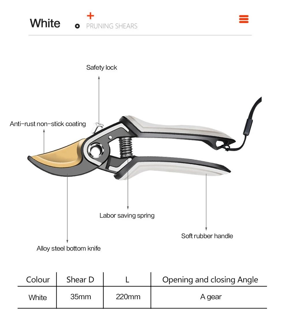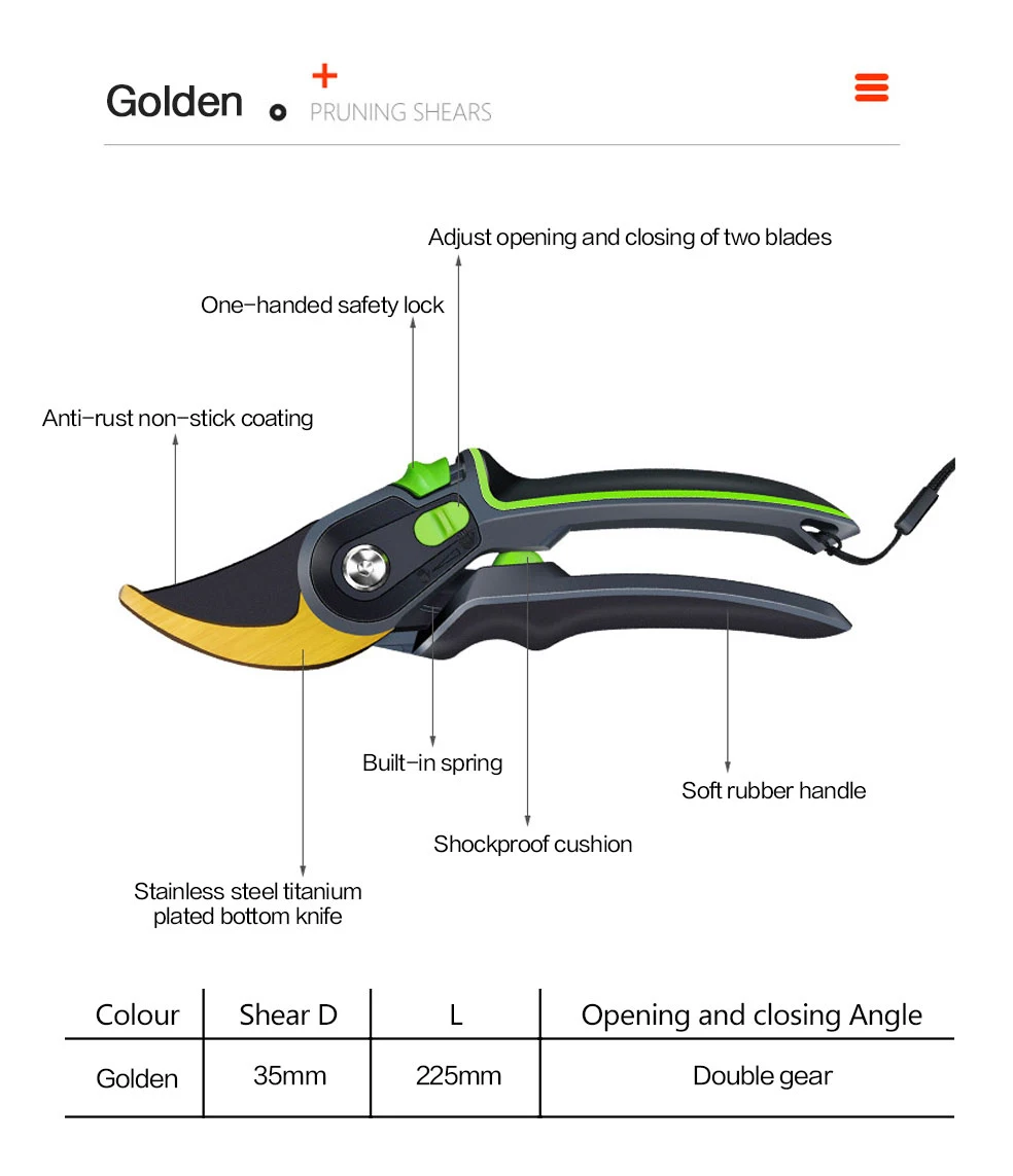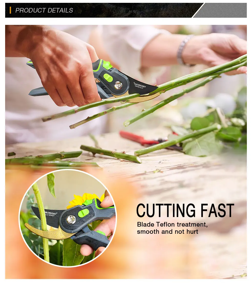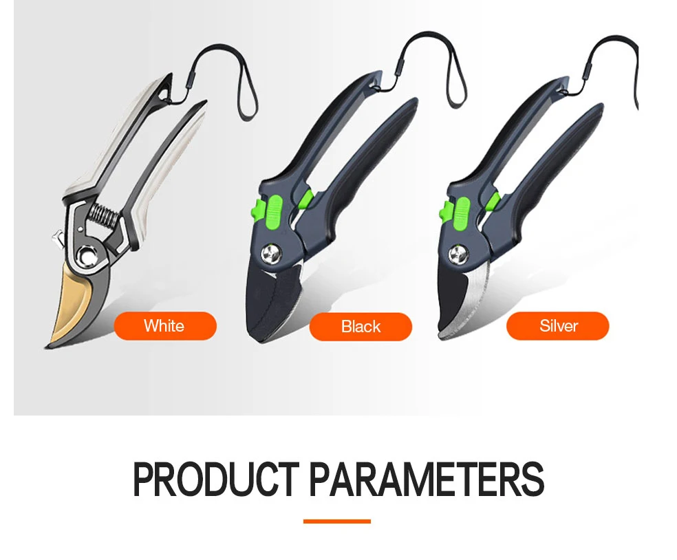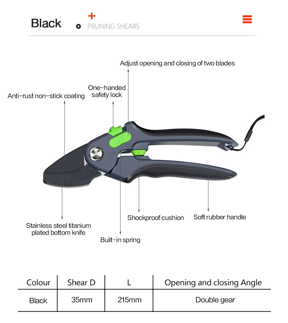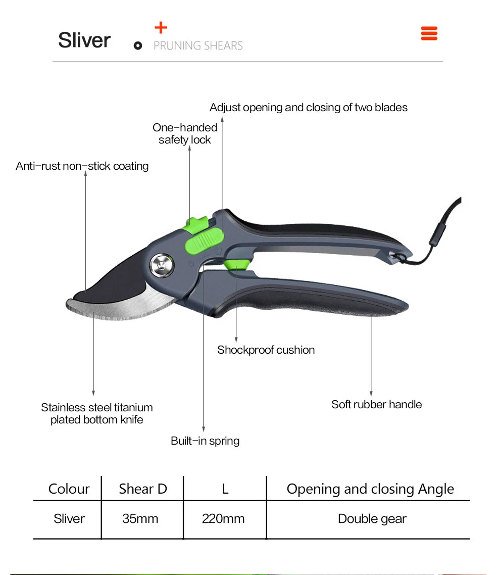 1. Качественное лезвие изготовлено из сверхтонкой технологии полировки. 2. Эргономичные Нескользящие ручки прочные, легкие и удобные. 3. Секаторы могут разрезать ветви деревьев диаметром до 3/4 дюйма. Это может варьироваться в зависимости от вида деревьев. 4. Подходит для полумеханизированной работы саженцев дыни, таких как фруктовые ветви, арбузы и огурцы.