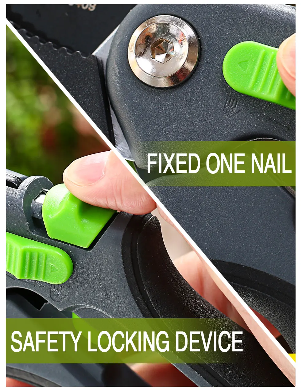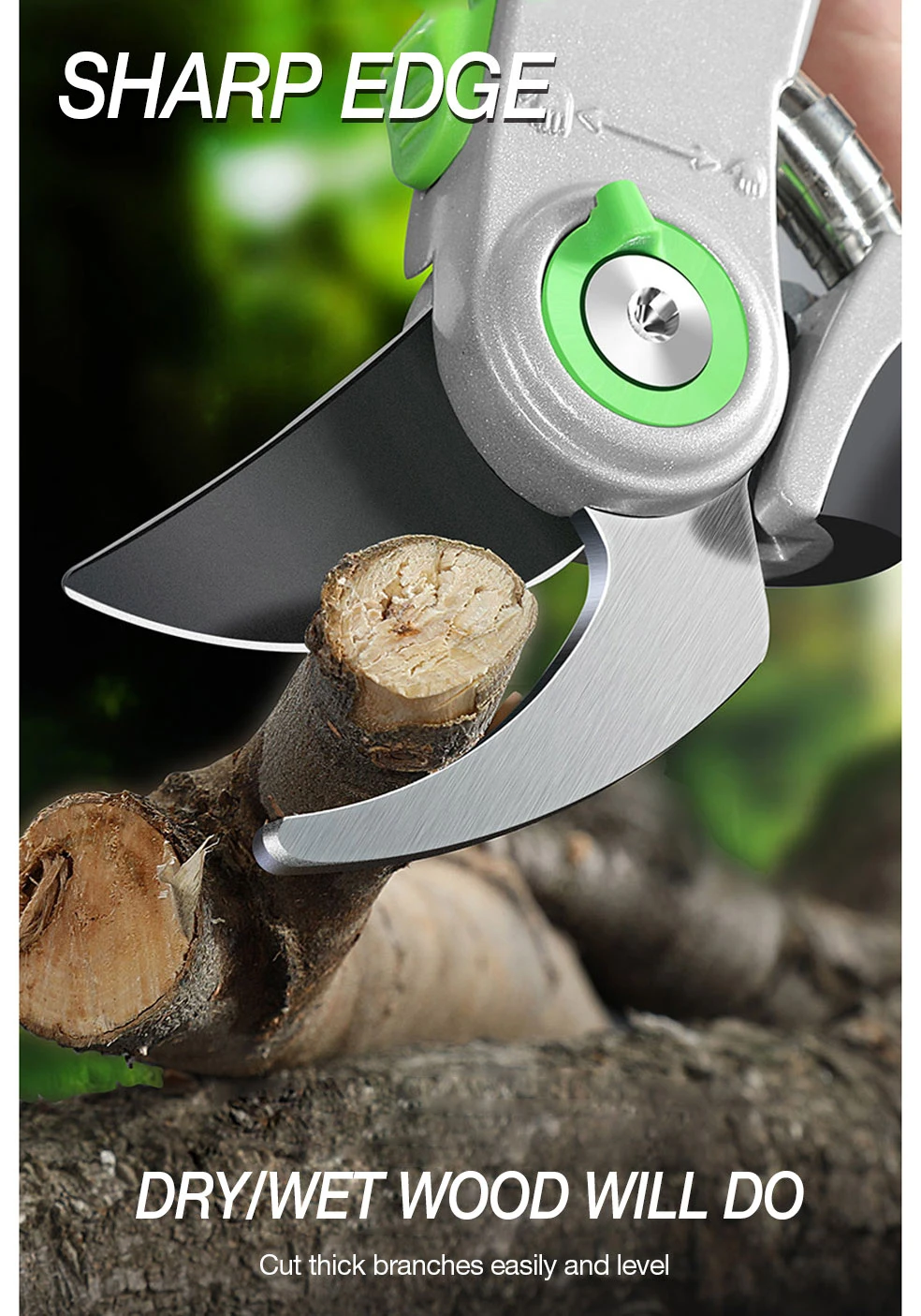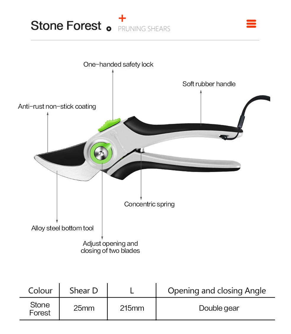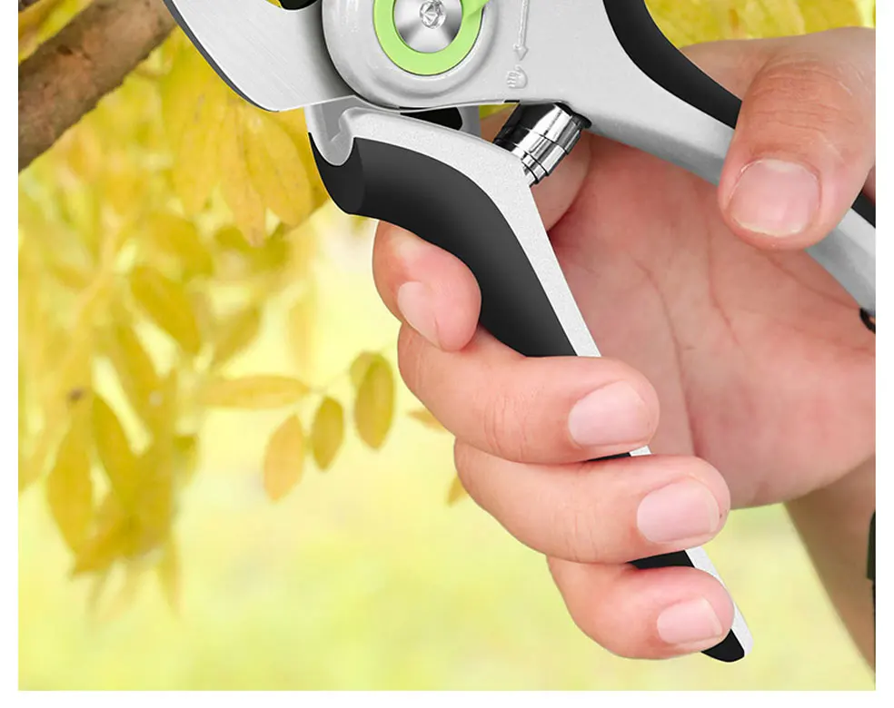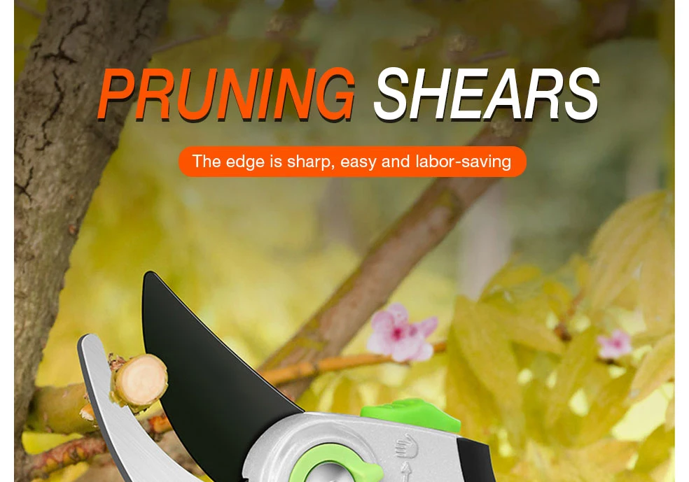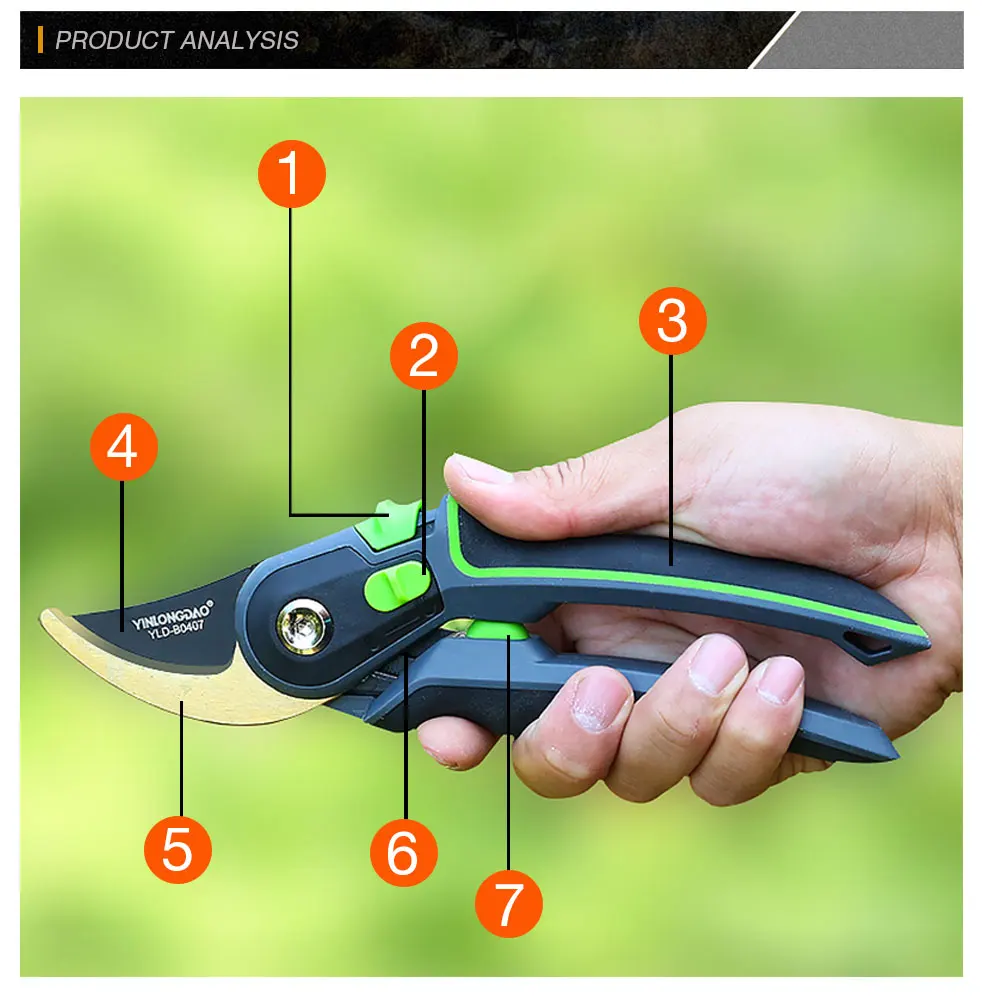 1. Качественное лезвие изготовлено из сверхтонкой технологии полировки. 2. Эргономичные Нескользящие ручки прочные, легкие и удобные. 3. Секаторы могут разрезать ветви деревьев диаметром до 3/4 дюйма. Это может варьироваться в зависимости от вида деревьев. 4. Подходит для полумеханизированной работы саженцев дыни, таких как фруктовые ветви, арбузы и огурцы.