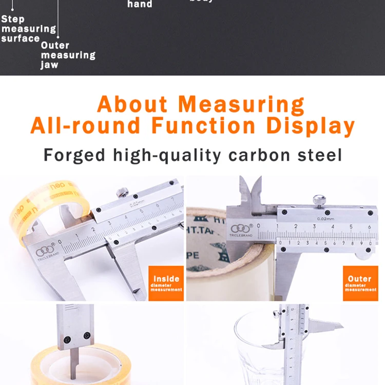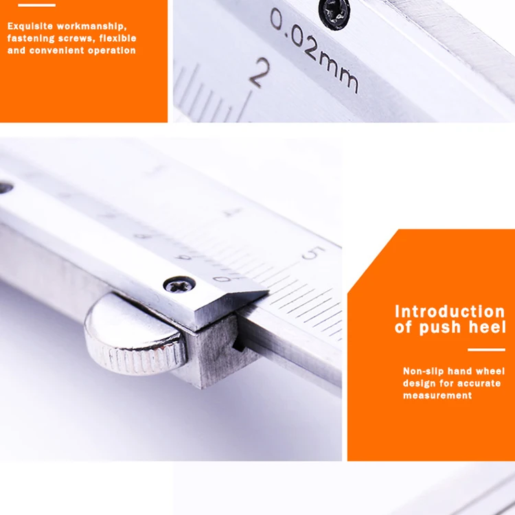 1. Процесс Лазерной Калибровки Передовая технология гарантирует, что шкала все еще может быть хорошо видна при длительном использовании. Наружный диаметр, внутренний диаметр, шаг и глубина используются для четырех целей измерения и промышленного производства 2. Ознакомление с гравировкой Лазерная гравировка, 0,02 мм точность, чтобы обеспечить гладкий и гладкий корпус линейки, плавное взаимодействие 3. Крепежный винт Тонкое мастерство, крепежные винты, гибкое и удобное управление 4. Введение толчка пятки Нескользящая конструкция ручного колеса для точного измерения 5. Введение материала Изготовлен из высококачественной стали с современной технологией, полностью металлическая хромированная антикоррозийная обработка поверхности, закаленная измерительная поверхность для обеспечения долговечности