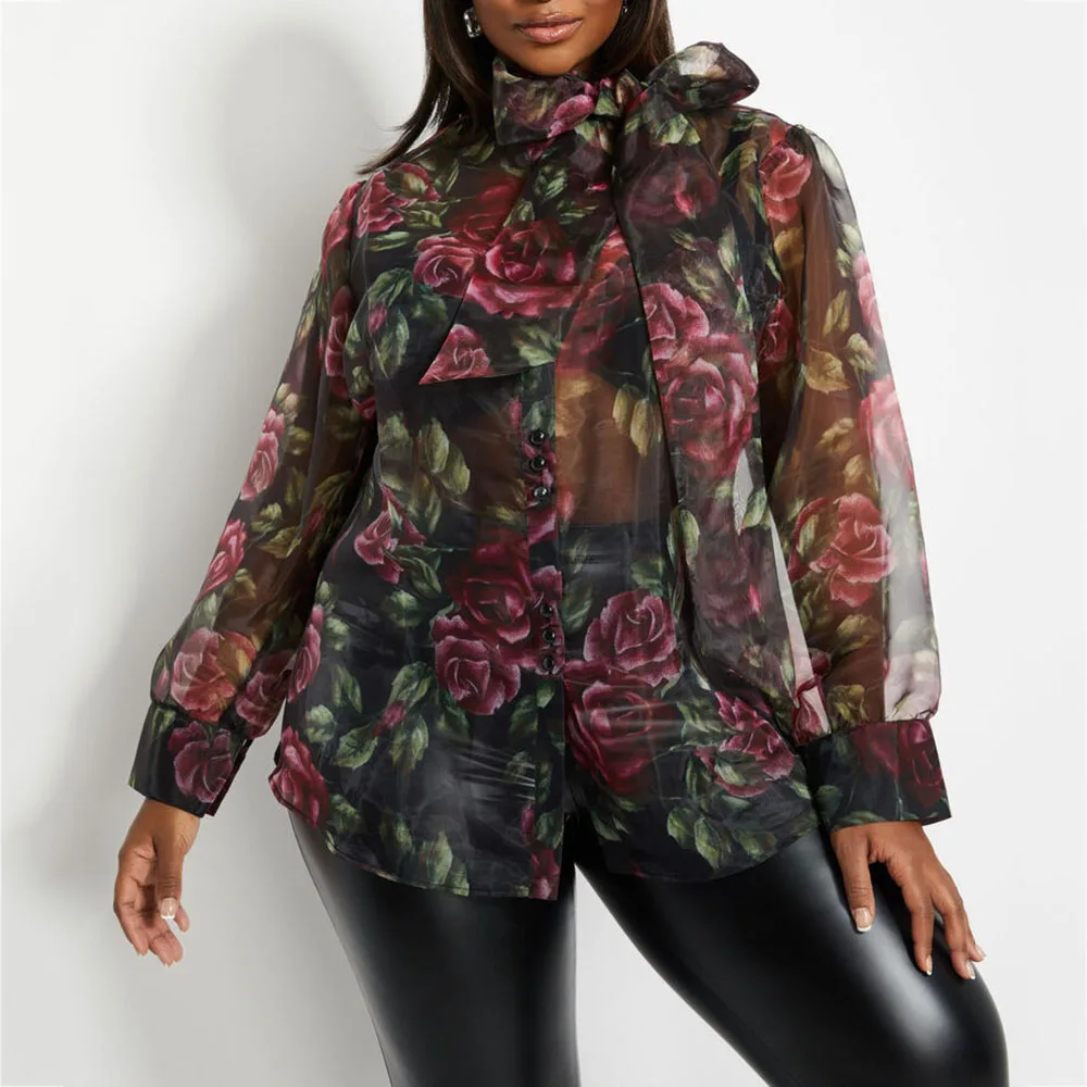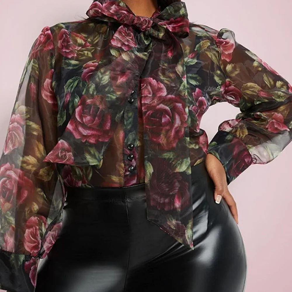 Сексуальные просвечивающие женские топы, блузки с цветочным принтом, блузка с длинным рукавом, плюс размер, лето 2020, галстук-бабочка, винтажные Прозрачные рубашки в стиле ретро