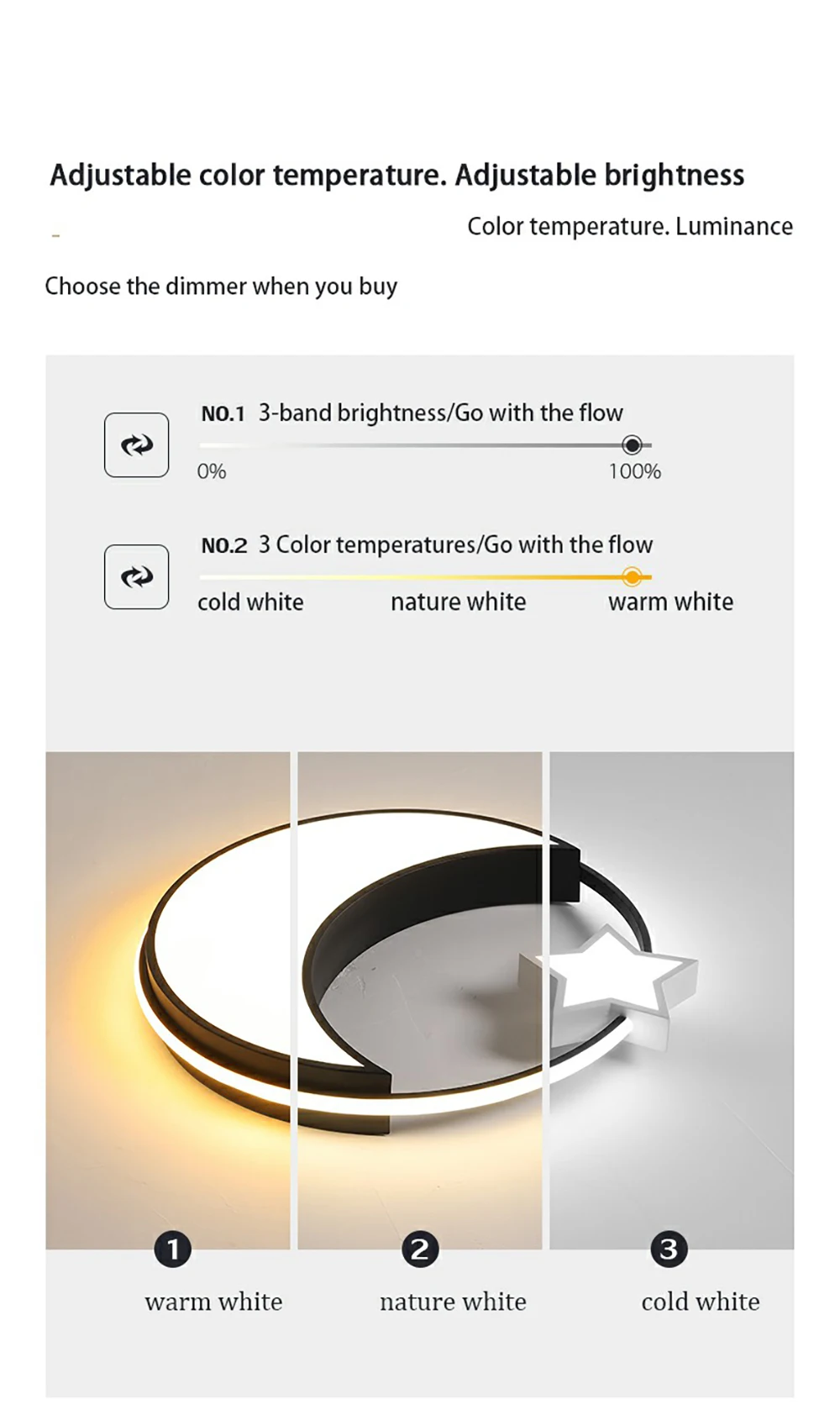 1. Выберите «холодный белый без пульта дистанционного управления» и «теплый белый без пульта дистанционного управления», есть только один светлый цвет, и яркость света не может быть отрегулирована. Выберите «затемнения с пультом дистанционного управления» для регулировки яркости и цвета света через пульт дистанционного управления.