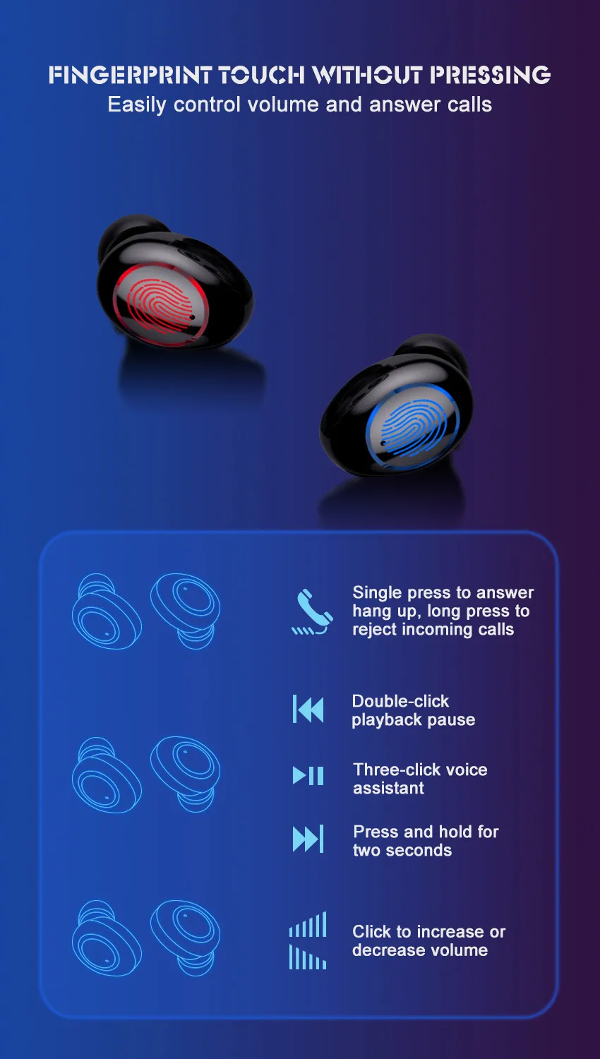 Параметры производительности наушников L/R Версия Bluetooth: V5.1 Рабочая частота: 2,402-2,480 ГГц Профили Bluetooth: A2DP/HFP/HSP/AVRCP Расстояние передачи: 10 м Уровень мощности: класс 2 Зарядный входной стандарт: Сенсорная точка, постоянный ток 5 В/0,5a Литиевая батарея: 45 мАч * 2 Время зарядки: около 40 мин Время воспроизведения музыки: около 3-4 часов Время ожидания: около 4 часов. Параметры производительности зарядного устройства Вход стандарт: DC 5V/0,5-1A Выходной стандарт: Сенсорная точка, DC 5V/0.5A Стандарт зарядки: Micro-USB,DC 5V/0,5-1A Литиевая батарея: 500 мАч Время зарядки: около 1,5 часов Время работы в режиме ожидания: около 300 часов Время зарядки: около 6 раз литиевая батарея
