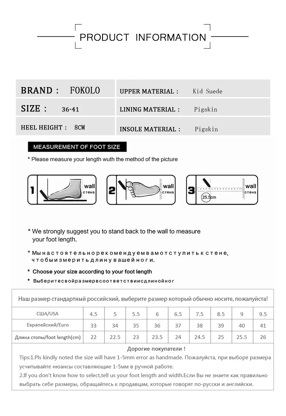 1. Так как в процессе изготовления нашей обуви клей, на обуви будет немного клея, мы постараемся сделать все возможное, чтобы избежать, но это не может быть 100%, пожалуйста, обратите внимание, что в наличии. 2. Небольшая нить на обуви-это нормальное явление, особенно для сапог. Это не повлияет на качество. Если вам это не нравится, пожалуйста, подумайте дважды, прежде чем сделать заказ. 3. Мы тщательно проверим размер после вашего заказа. Но поскольку размер зависит от формы, ширины и длины стопы. Нам очень сложно гарантировать, что размер будет на 100% подходить. Вам нужно рискнуть, спасибо.