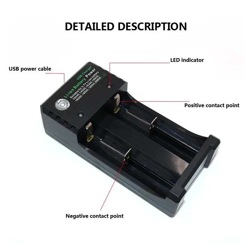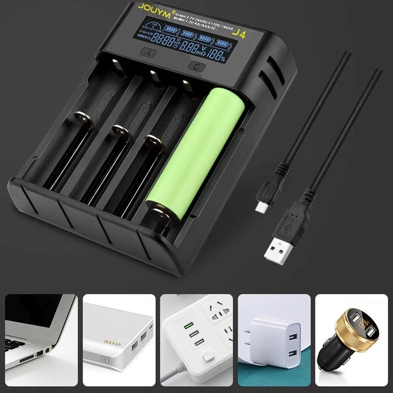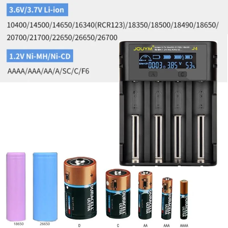 Умный ЖК-дисплей 4 слота работают независимо Множественная защита 3 зарядный ток (500мА/1000мА/2000ма) Функция активации напряжения 0 В Интеллектуальное распознавание литиевой батареи (li-ion)/ 0 никель-металл гидрид (NiMH/Cd) батарея Параметры зарядки: Ni-MH/Ni-Cd аккумулятор Входная мощность: 5 В 2 а постоянного тока Ток 1A/2A CC: 05A x 4 Литий-ионный аккумулятор 0.5A CC ток: 05A x 4 Ток 1A CC: 1A x 2 Ток 2A CC: 2A x 1 Совместим со всеми перезаряжаемыми батареями: Ni-MH/Cd,AA,AAA,A,SC, F6 C Li-ion/IMR/LiFePO4: 20700 21700 22650 25500 26650 18350 18500 18650 18700 17335 17500 17670 16340 10440 14500 14650 Умная обратная полярность и защита от короткого замыкания. Зарядка с usb-адаптером 5 В, рекомендуемый ток адаптера 2 А. Упаковка: Зарядное устройство * 1 USB кабель * 1 (Не содержит адаптер)
