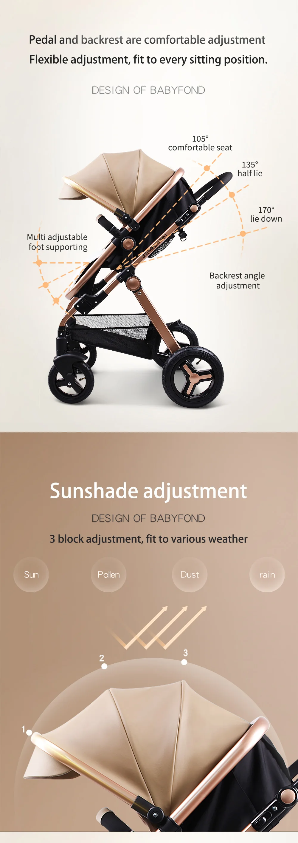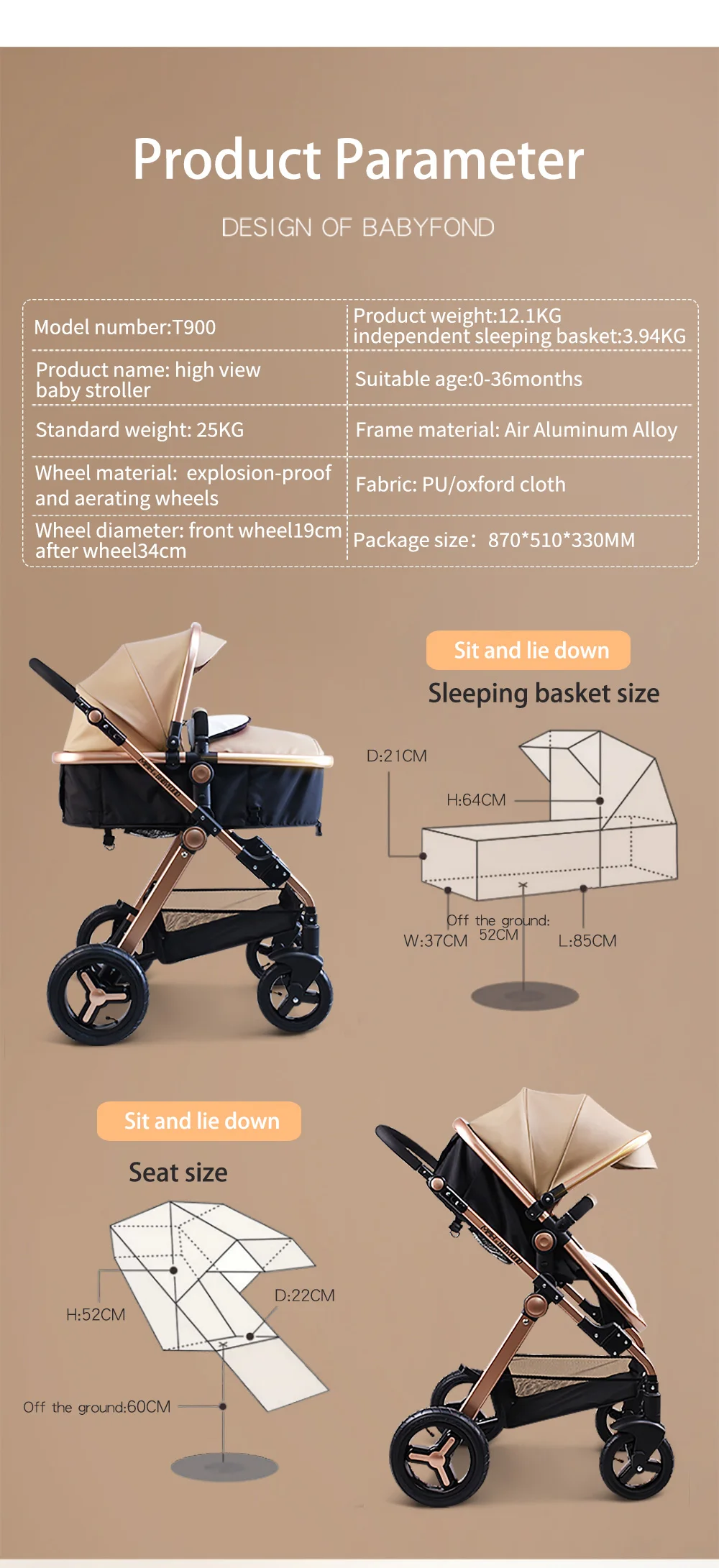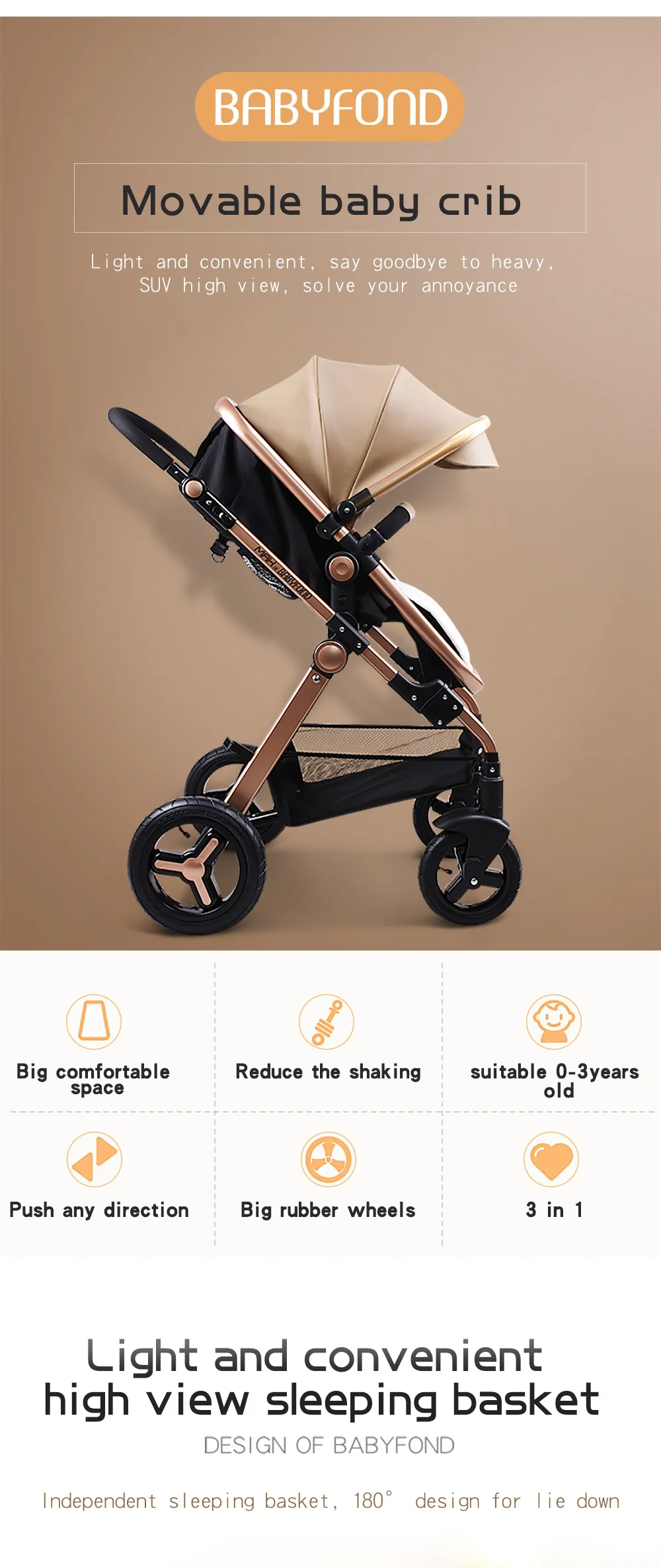 Посылка: 3 в 1 = рама + 2 в 1 корзина + детское автокресло + 4 колеса + бесплатные подарки Спецификация: Бренд: Babyfond Диаметр колеса: переднее колесо 19 см заднее колесо 30 см Материал оправы: авиационный алюминиевый сплав Стиль: коляски и Система путешествий Вес изделия: 16 кг Подшипник: 25 кг Посылка: 87*51*33 см Подходит для ребенка: 0-36 месяцев Примечание: Сиденье коляски может быть преобразовано в спальную корзину. Это просто функциональное преобразование Коляска для детей 0-3 лет, нагрузка на подшипник 25 кг Автокресло для ребенка 0-12 месяцев, нагрузка на подшипник 15 кг