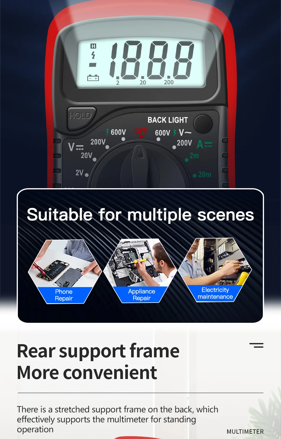 Мультиметр имеет четкий, легко читаемый ЖК-дисплей, белый задний светильник.