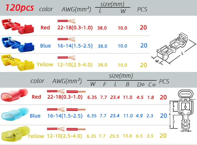 specification: Material: nylon, copper, tin Wire diameter: 22-18 AWG (red) / 18-14 AWG (blue) / 12 AWG (yellow) Maximum working temperature (): 221 degrees Celsius Recommended maximum voltage: 600 V Products include: T-tap cable connector -Red: 22-18 AWG; cable range: 0.5-15mm² -Blue: AWG 18-14; cable range: 1.5-2. 5mm² -Yellow: AWG 12; cable range: 2.5-4. 0 mm² Male connector -Red: 22-18 AWG; cable range: 0.5-15mm² -Blue: AWG 18-14; cable range: 1.5-2. 5mm² -Yellow: AWG 12; cable range: 2.5-4. 0 mm² For customer service: All buyers are 100% satisfied. Once you find any problem with the product, please feel free to contact us, we will solve it for you as soon as possible. 100% satisfied with the purchase without risk!