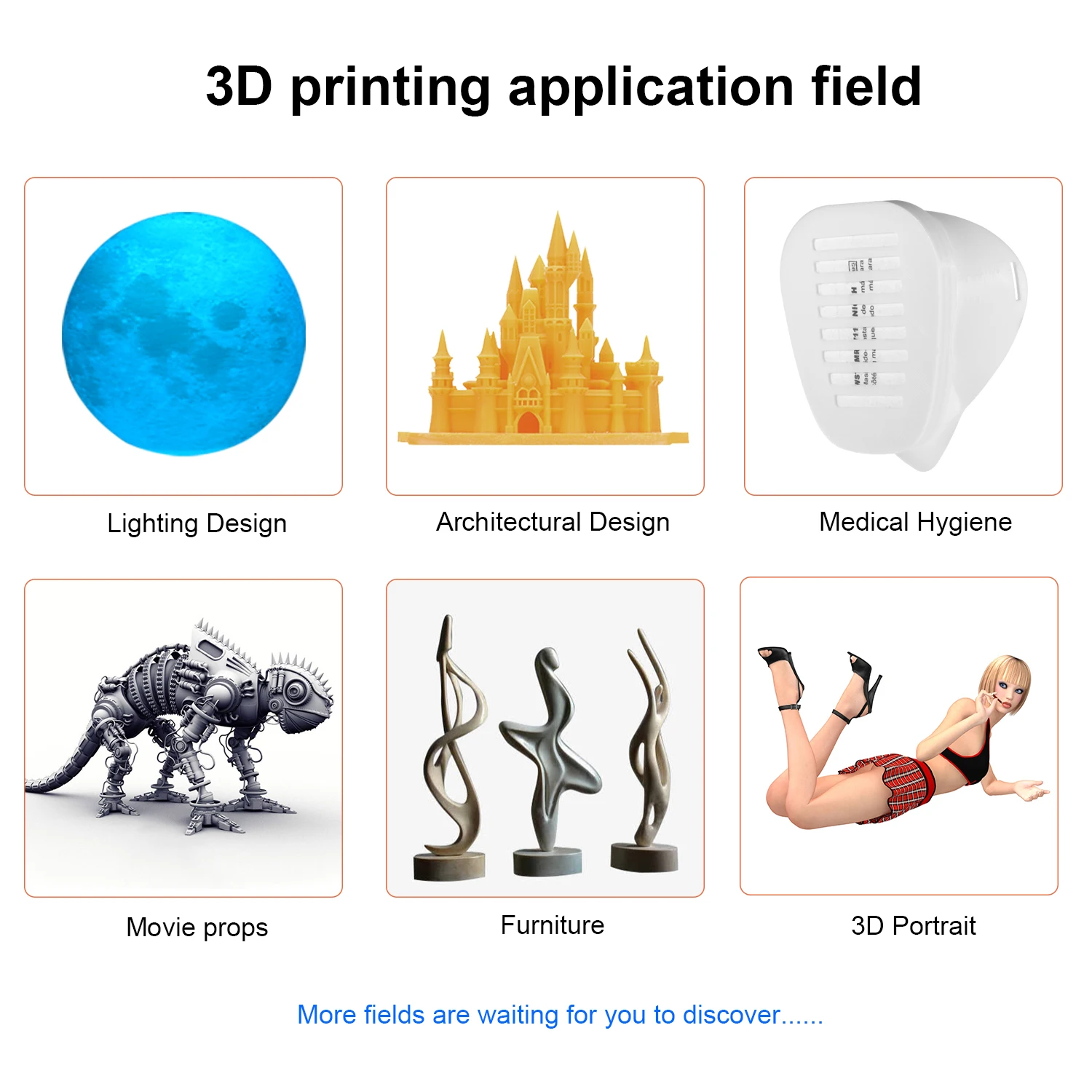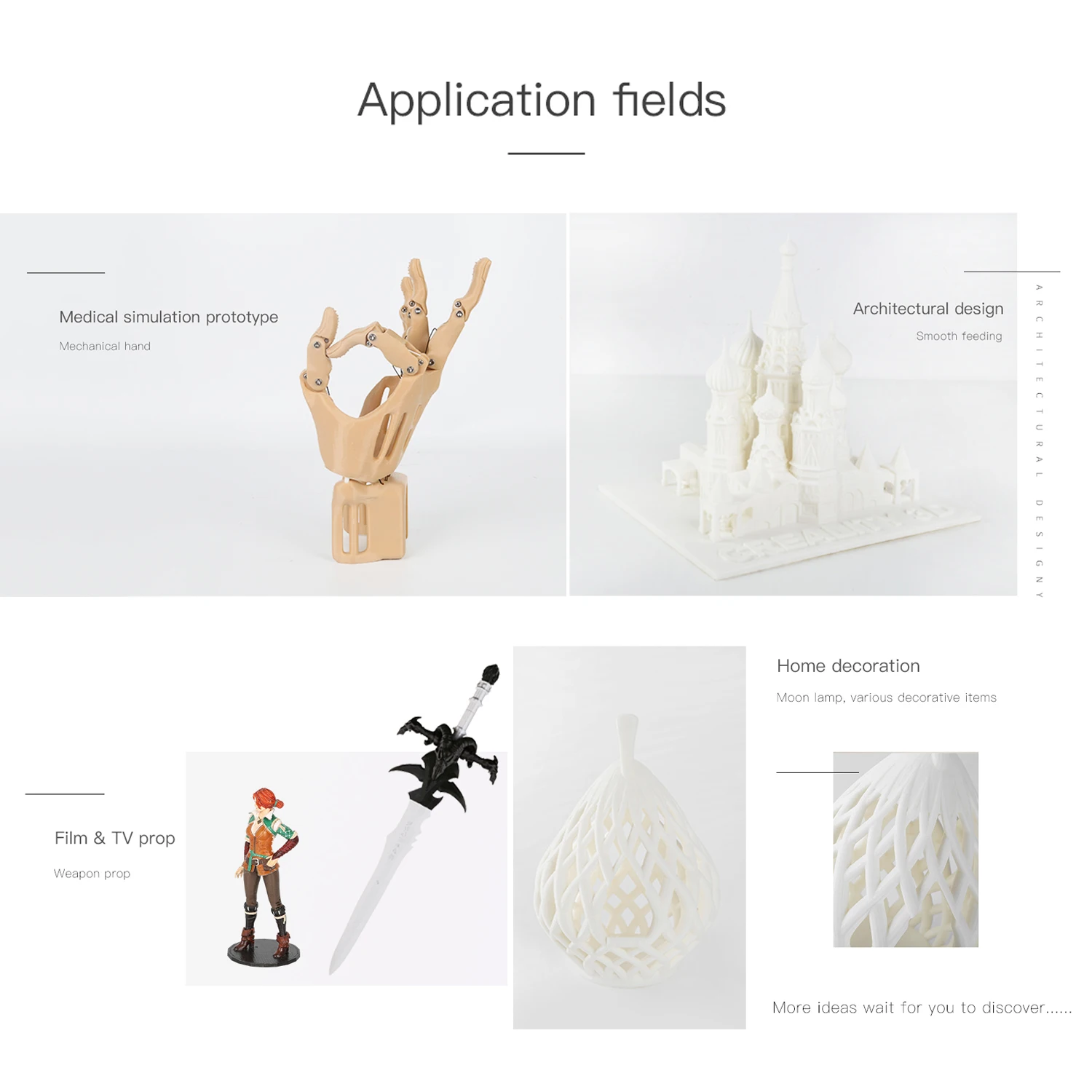 Широкая совместимость и применение:Совместимость с различными 1,75 мм печати, такими как PLA, ABS, TPU, углеродное волокно, и т. д.; Широко используется в домашнем дизайне, игрушки, аниме, ремесла, образования, медицины, и т. д.