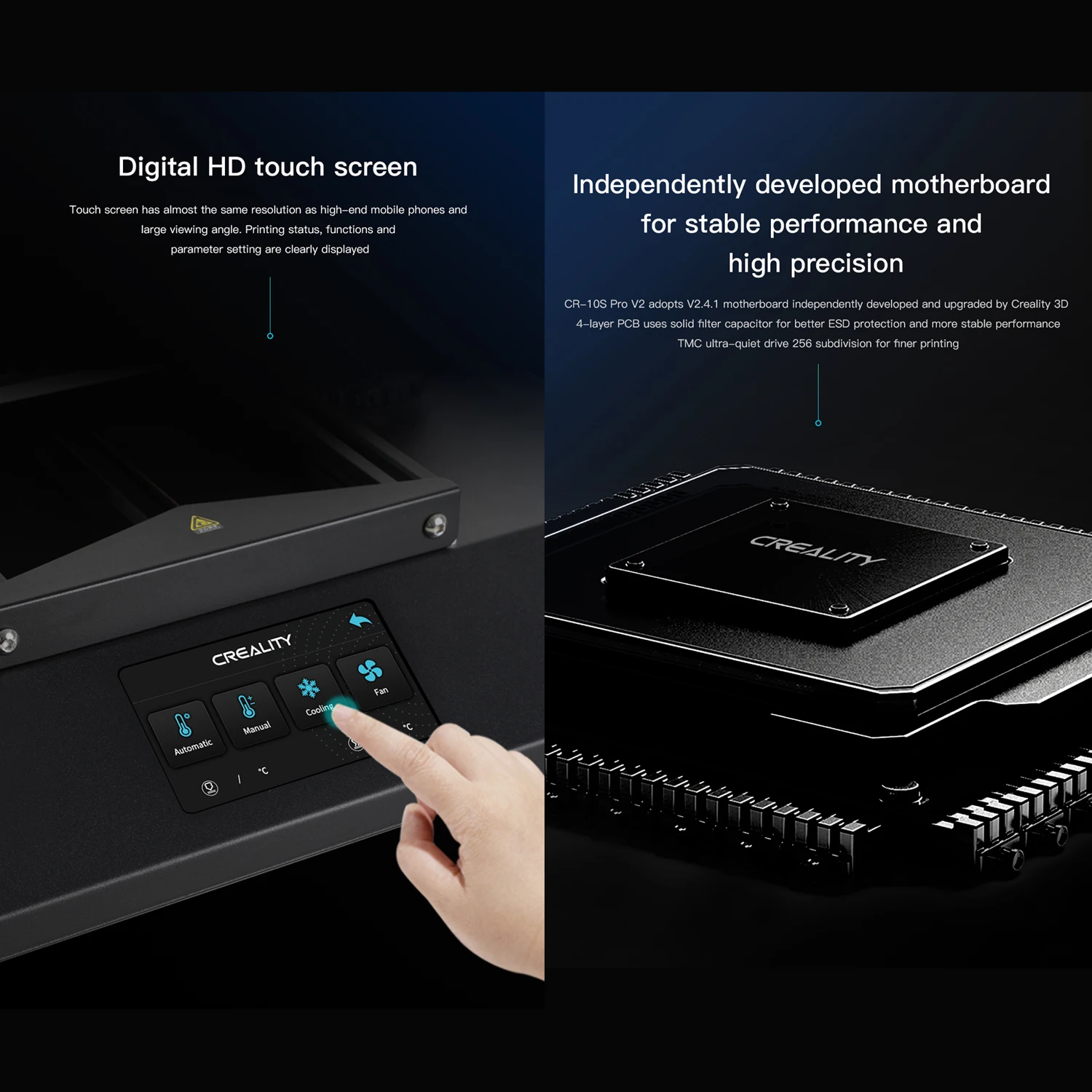 Материнская плата с производительностью:Принять V2.4.1 материнская плата самостоятельно разрабатывает и Creality 3D, 4-слойные PCB, использует твердый патрон фильтра конденсатор с алюминиевой крышкой, для лучшего защита от статического электричества и обеспечивая более стабильную работу. TMC ультра-тихий привод и 256 отдел для тонкой печати.