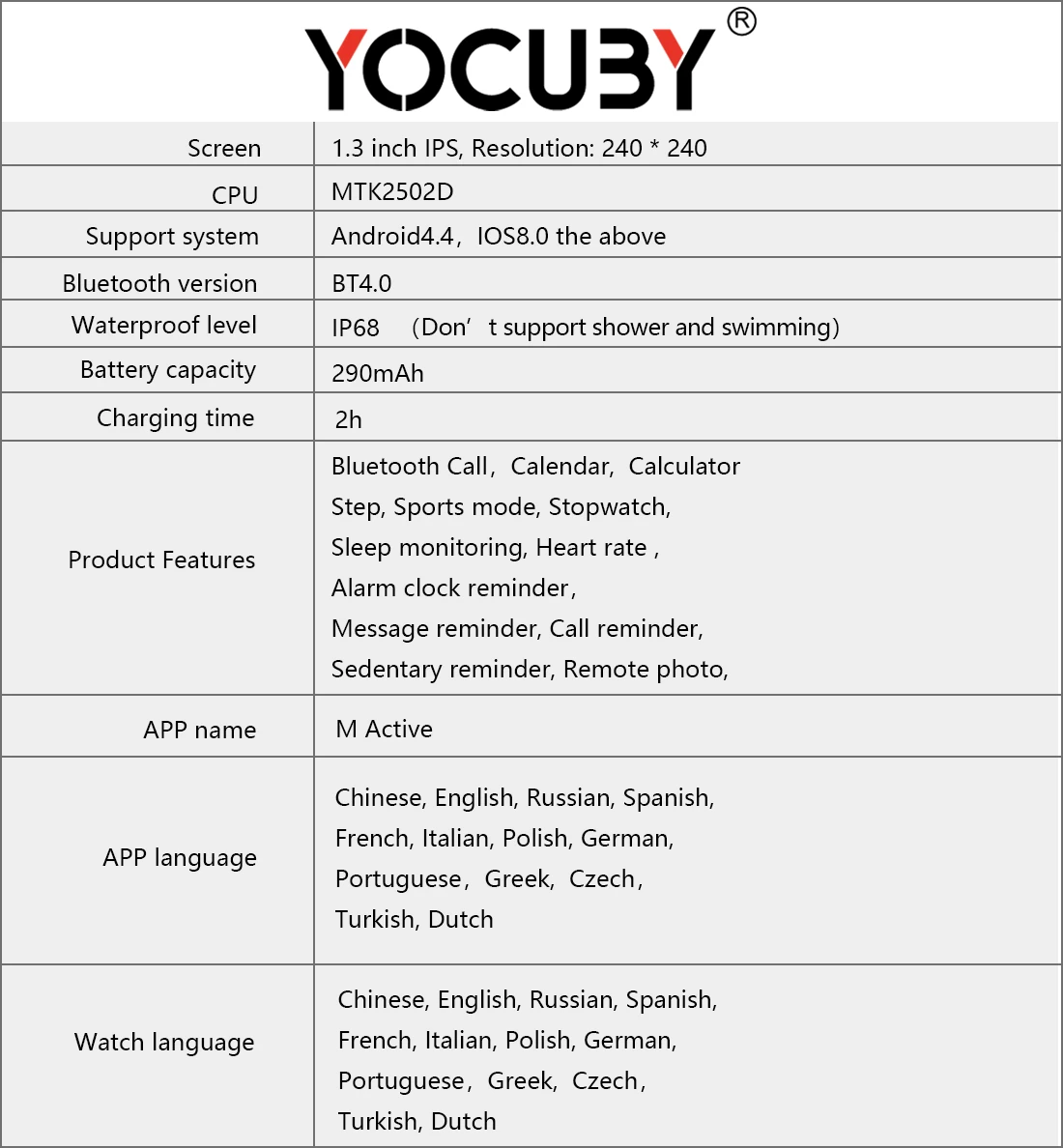 Основной пункт продажи продукта IP68 под струей воды (водонепроницаемый 1,5 м глубина погружения на 30 минут), шагомер, сердечный ритм, измерять кровяное давление, оксиметр, ЭКГ, вызовов через Bluetooth, уведомления о входящих звонках, синхронный дисплей входящих письмо содержание Платформа: MTK2502 Чехол: сплав/пластик Ремешок: подвижный Настольный болт, Ширина 22 мм, сетчатый ремешок/ремень 228 мм Подставка для зарядки: Магнитный зарядный кабель Экологически чистые продукты: Сертифицированные CE Цвет: холодный черный, ярко-Серебристый Память: 32 м + 32 м Основной экран: 1,3 HD IPS, 240*240 полный экран Сенсорный экран: емкостный полноразмерный сенсорный экран Уведомление по Bluetooth: входящий вызов, SMS, WeChat, QQ новости и другая информация о клиенте и другие коммуникации вовремя, чтобы напомнить Обнаружение сердечного ритма: мониторинг сердечного ритма, мониторинг сердцебиения круглосуточно Шагомер выбор нескольких режимов упражнений, подсчет шагов, потребление калорий, запись пробега упражнений Напоминание о сидячем положении, мониторинг сна, мобильный телефон функция поиска, воспроизведение музыки, мобильный телефон синхронизация книг, Синхронизация текстовых сообщений на мобильный телефон, система IOS в настоящее время не поддерживает. Синхронизация истории телефонных звонков Функция Bluetooth и версия: 3,0, 4,0 dual Bluetooth Характеристики и Емкость аккумулятора: встроенный литий-ионный полимерный аккумулятор 290 мАч Вибромотор: Поддержка Многоязычная Упаковка: китайский, традиционный, английский, немецкий, испанский, итальянский, французский, португальский (Португалия), португальский (Бразилия), русский, польский, арабский, турецкий, японский, корейский Другие функции: будильник, календарь, секундомер, компьютер и т. Д.