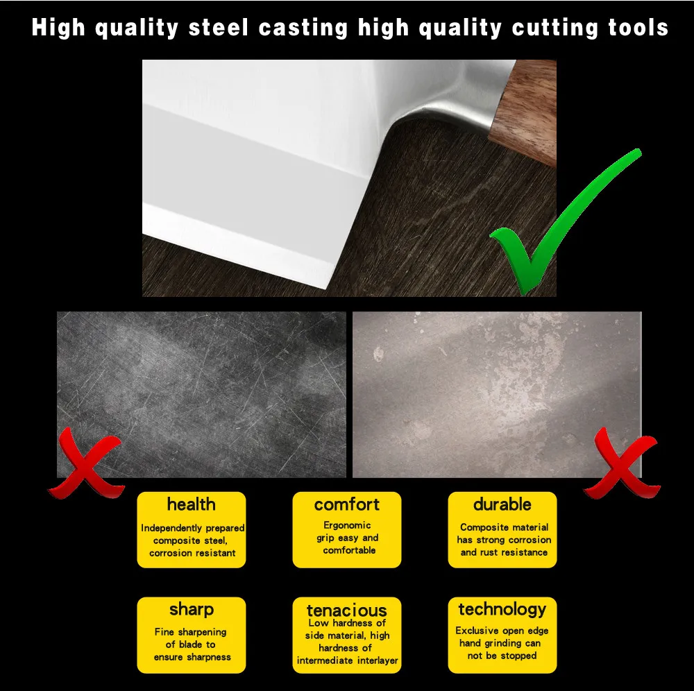 Материал лезвия: нержавеющая сталь 4Cr13 Материал ручки: цветная древесина Дизайн ручки: бесшовная сварка Толщина лезвия: 3,17 мм Размер: 295*175*85 мм Функция: используется для резки, измельчения, нарезки, измельчения, нарезки и т. д. Нож из нержавеющей стали хорошего качества и высокая производительность при резкости Резка различных видов пищи, острый край, легкий и удобный нож из нержавеющей стали. Идеальный кухонный нож изготовлен из высококачественного лезвия из нержавеющей стали. Идеально подходит для резки пищи с ручкой из нержавеющей стали, что обеспечивает более сильное сцепление для предотвращения усталости рук.