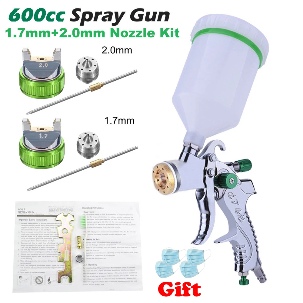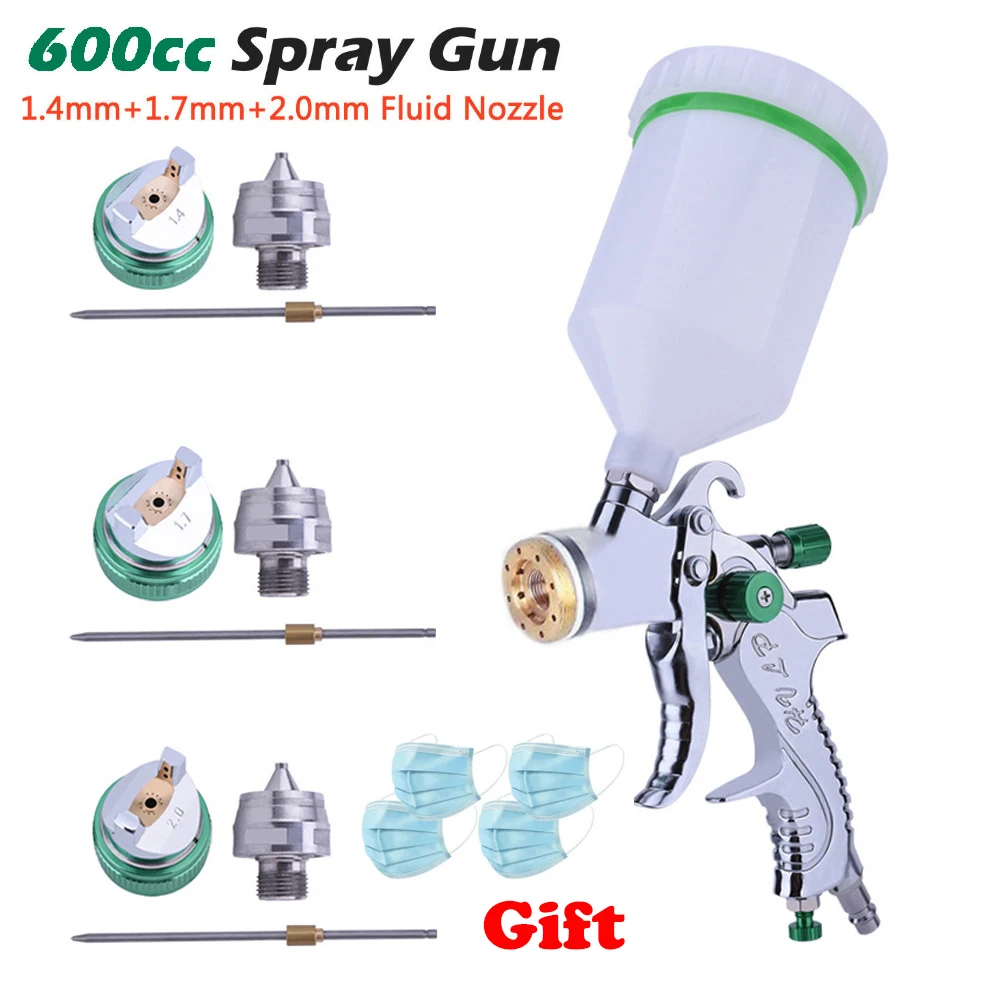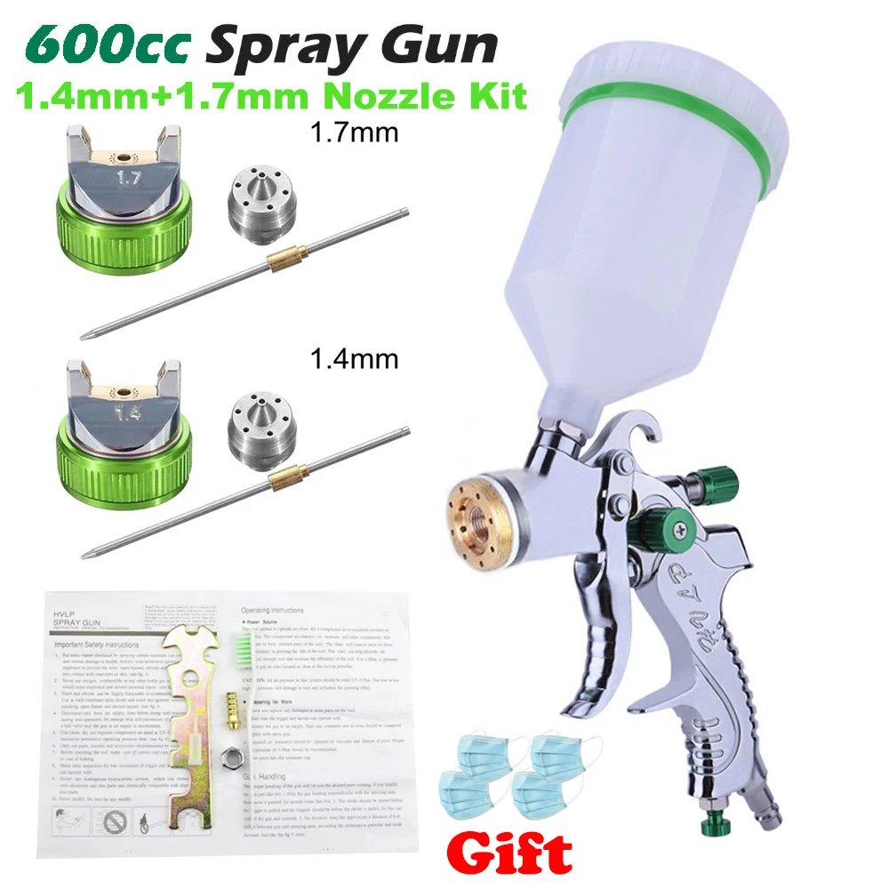 Материал распылителя: алюминиевый сплав Материал чашки: ПВХ Цвет: зеленый и серебристый Тип: высокий объем низкого давления Сопло жидкости: 1,4 мм, 1,7 мм, 2,0 мм Расход воздуха: 14.5CFM Операционной Давление: 2-3,5 бар Ширина узора: 160-240 мм Размер бункера: диаметр 10 см Воздухозаборник: 1/4 дюйма Емкость чашки: 600cc