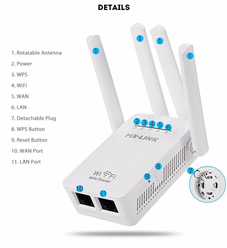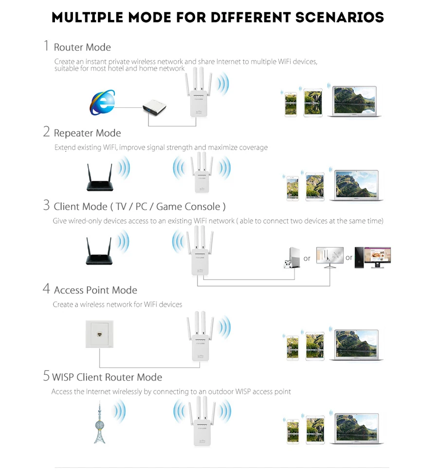 Встроенный адаптер питания, поставляет штепсельные вилки адаптера питания во все страны, поддерживает маршрутизатор, ретранслятор, WISP, режим клиента и AP. Увеличение зоны покрытия сигнала WiFi