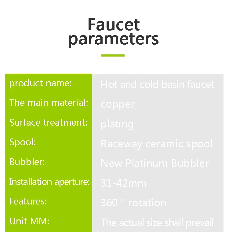 Название продукта: кран для горячей и холодной раковины Основной материал: медь Обработка поверхности: покрытие Катушка: керамическая катушка Raceway Барботер: Новый Платиновый барботер Диафрагма установки: 31-42 мм Особенности: вращение на 360 ° Единица мм: фактический размер должен превалировать
