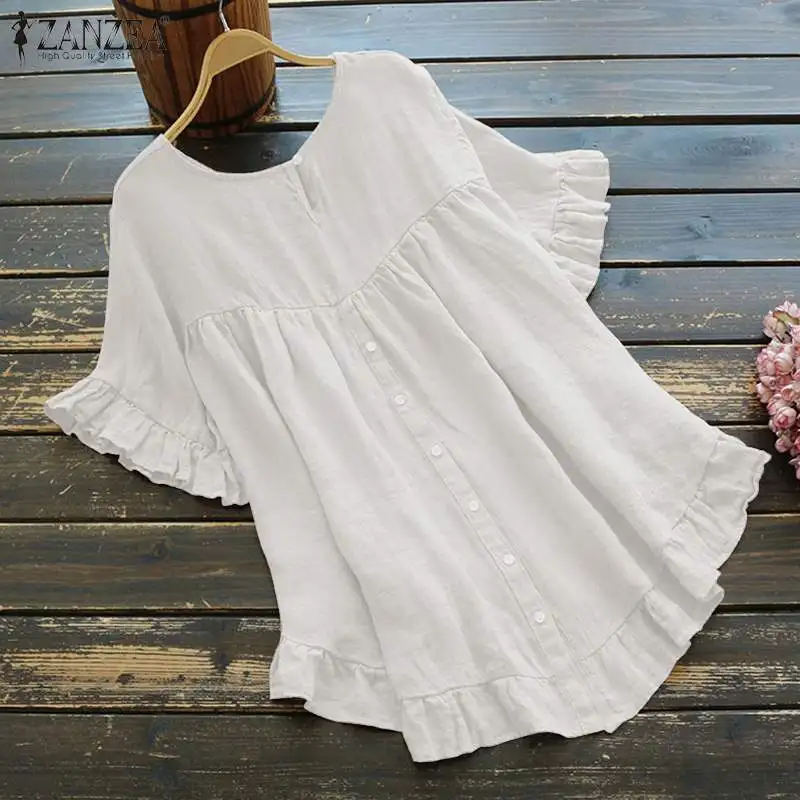 | Тип товара: блузка Материал: 100% хлопок Цвета: розовый, белый Посылка входит: 1 блузка Тип Посадки: свободный Воротник: круглый вырез Стиль рукава: рукав с оборками Длина рукава: средний рукав Тип застежки: пуговицы Узор: однотонный Толщина: Стандартная Стиль: Повседневный Сезон: весна, лето, осень Повод: ежедневно