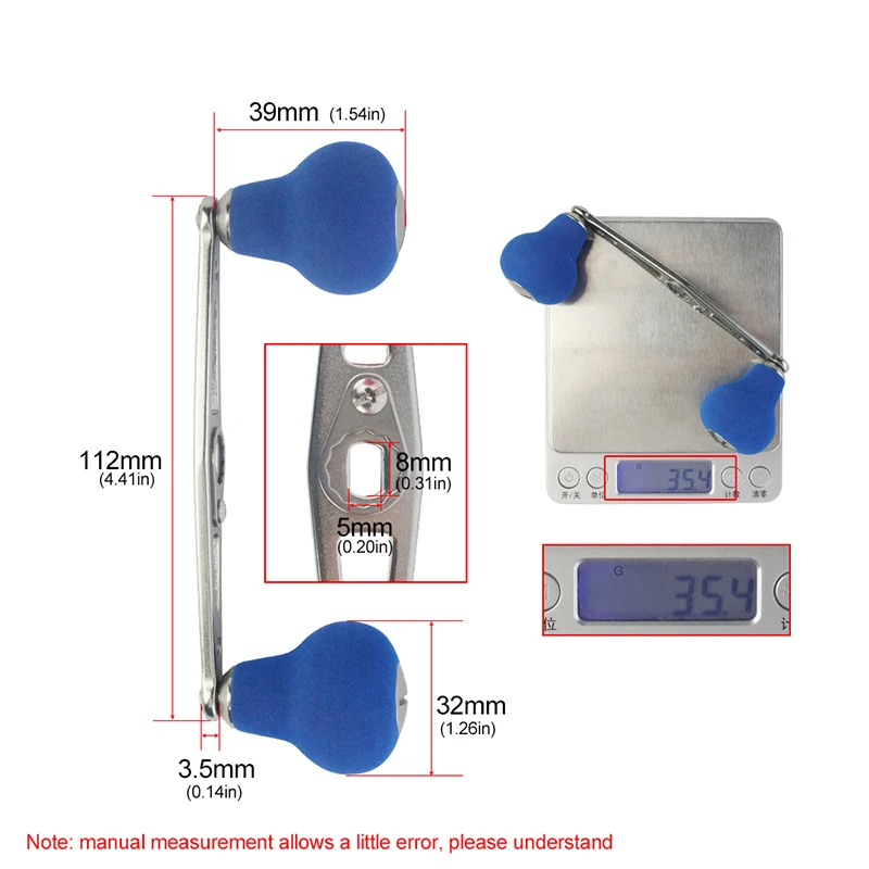 Цвет: как на картинке Материал ручки: алюминиевый сплав Посылка: 1 шт./лот Длина: 112 мм Вес: около 35-36 г Размер отверстия в сборке: 8x5мм Подходит для: катушка Daiwa
